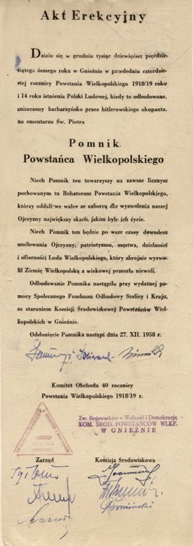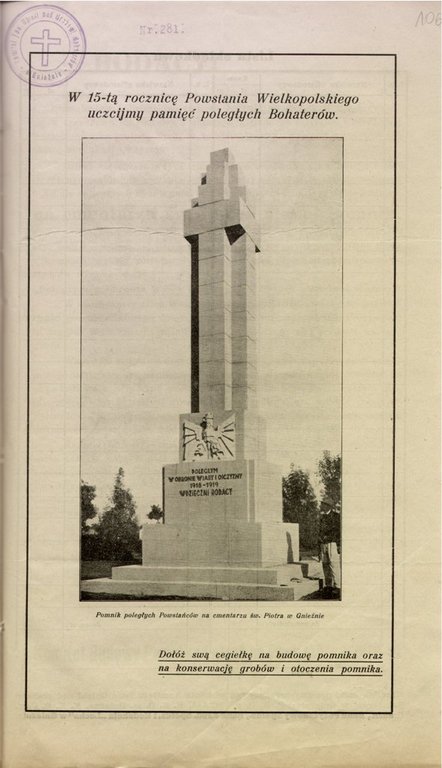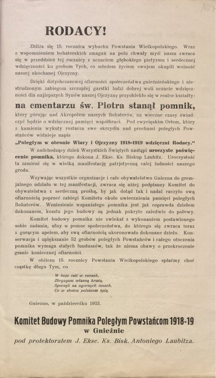 1. APPOG, Akta miasta Gniezna, sygn. 886, k. 106, Cegiełka na budowę Pomnika Powstańców