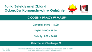 Miasto Gniezno prowadzenie Punktu Selektywnego Zbierania Odpadów Komunalnych (PSZOK) powierzyło firmie URBIS Sp. z o. o. z siedzibą w Gnieźnie przy ul. Bolesława Chrobrego 24/25.