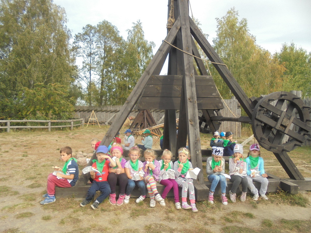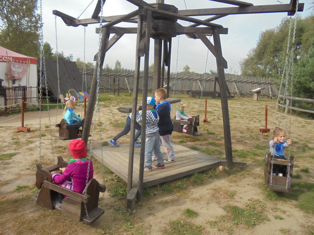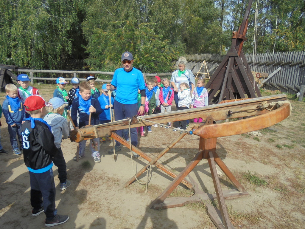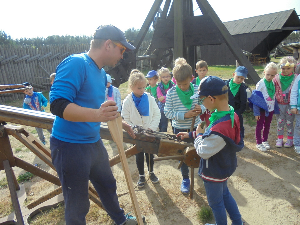 Dzieci pod okiem przewodnika - komesa grodu, zwiedziły drewniane piastowskie fortyfikacje, zbrojownię, unikalną wystawę średniowiecznych machin oblężniczych: taran, onager, hak niszczycielski. Przedszkolaki mogły dotknąć wszystkich eksponatów i aktywnie uczestniczyć w obronie grodziska. Wszyscy - nie tylko chłopcy, ale również dziewczęta - z wielkim zaciekawieniem uczestniczyli w strzelaniu z kuszy wałowej czy kamieniami z katapulty. Każdy chciał na własnej skórze przekonać się, jak ciężka jest zbroja oraz wyposażenie wojownika. Dużym powodzeniem cieszyła się też starodawna karuzela wzorowana na kieracie, poruszana siłą mięśni przez panie i dzieci.
