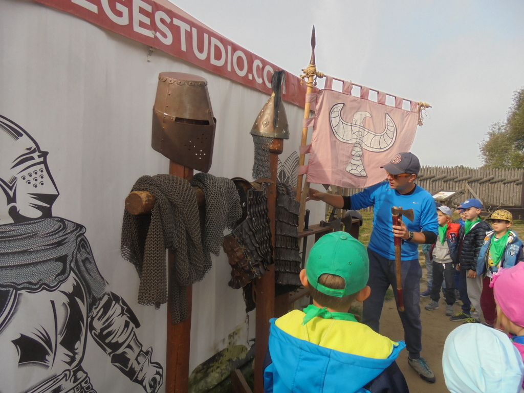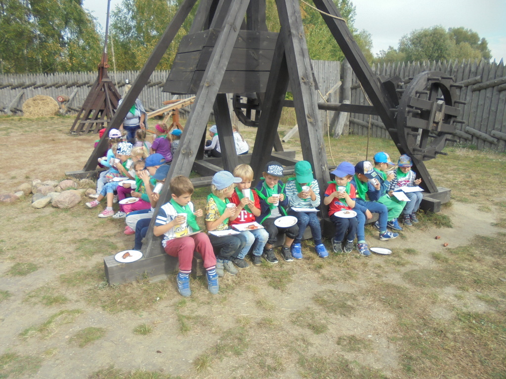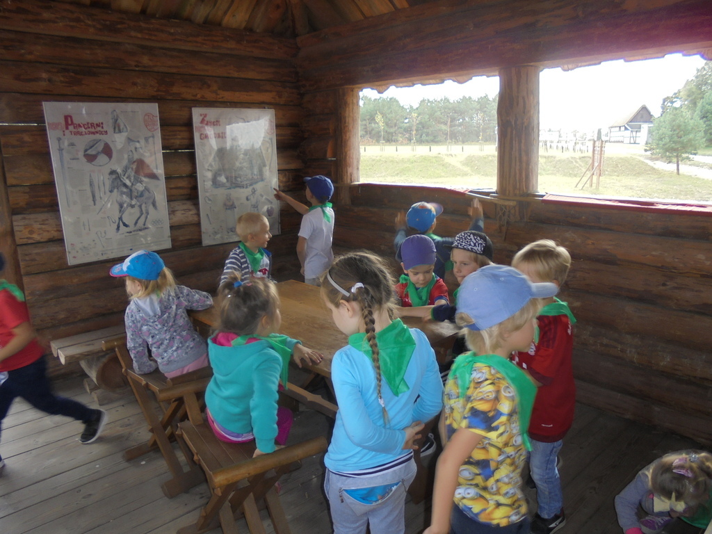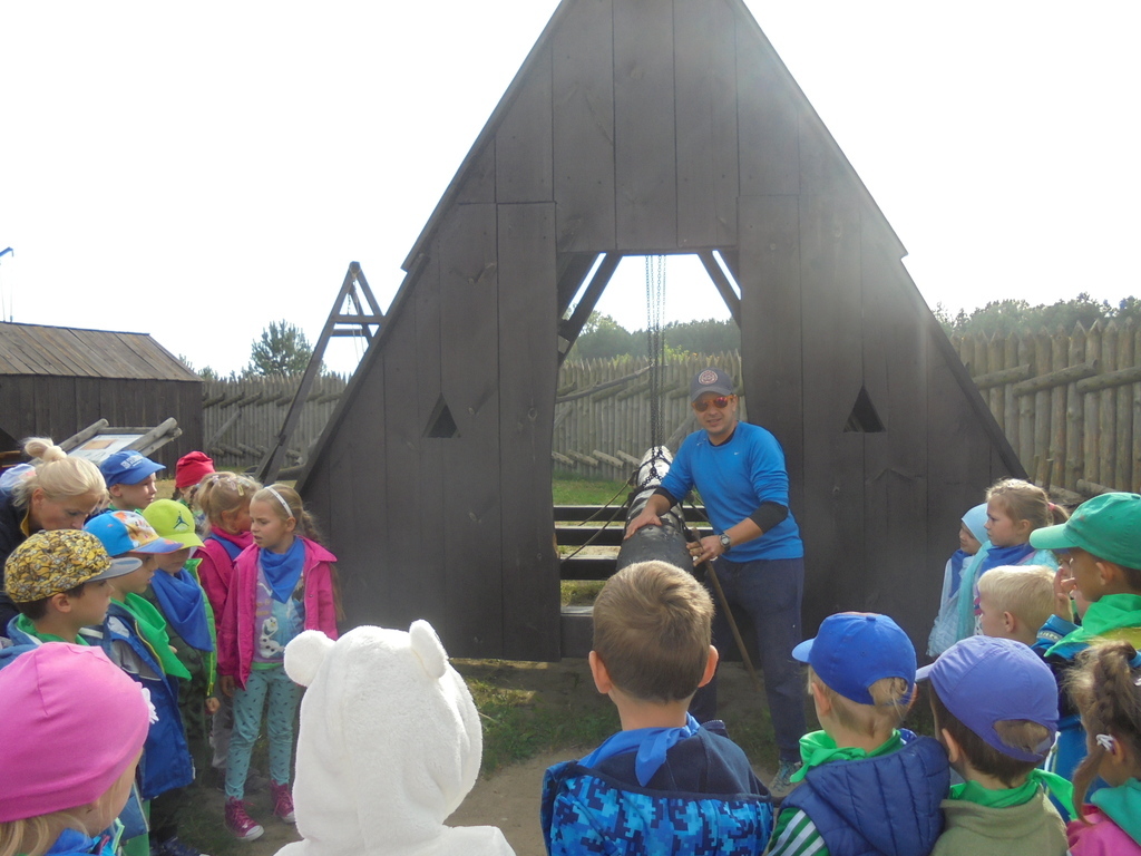 Dzieci pod okiem przewodnika - komesa grodu, zwiedziły drewniane piastowskie fortyfikacje, zbrojownię, unikalną wystawę średniowiecznych machin oblężniczych: taran, onager, hak niszczycielski. Przedszkolaki mogły dotknąć wszystkich eksponatów i aktywnie uczestniczyć w obronie grodziska. Wszyscy - nie tylko chłopcy, ale również dziewczęta - z wielkim zaciekawieniem uczestniczyli w strzelaniu z kuszy wałowej czy kamieniami z katapulty. Każdy chciał na własnej skórze przekonać się, jak ciężka jest zbroja oraz wyposażenie wojownika. Dużym powodzeniem cieszyła się też starodawna karuzela wzorowana na kieracie, poruszana siłą mięśni przez panie i dzieci.