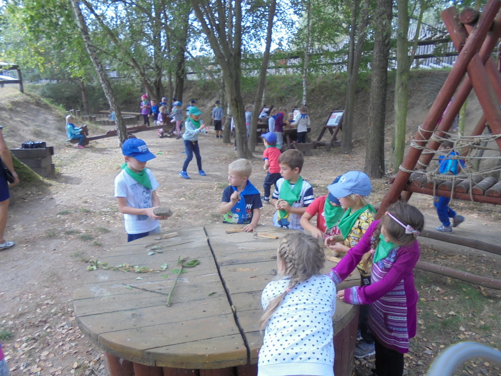 Ciepła i słoneczna pogoda sprzyjała też zabawom ruchowym na unikatowym, historycznym placu zabaw, gdzie dzieci korzystały z piaskownicy, chybotek, drewnianych gier (młynek, warcaby). Wiele radości dostarczyła przedszkolakom także wspinaczka po linach i na wieżę czy pokonywanie toru przeszkód. Nie zabrakło również atrybutów piknikowych - ogniska i pieczonych kiełbasek, które w nietypowej, militarnej scenerii smakowały dzieciom wybornie. Tak zorganizowana impreza plenerowa miała głównie na celu propagowanie aktywnego spędzania czasu na powietrzu o każdej porze roku - również jesienią. Była też dla przedszkolaków wspaniałą przygodą w formie „żywej lekcji historii”- nauki poprzez zabawę.