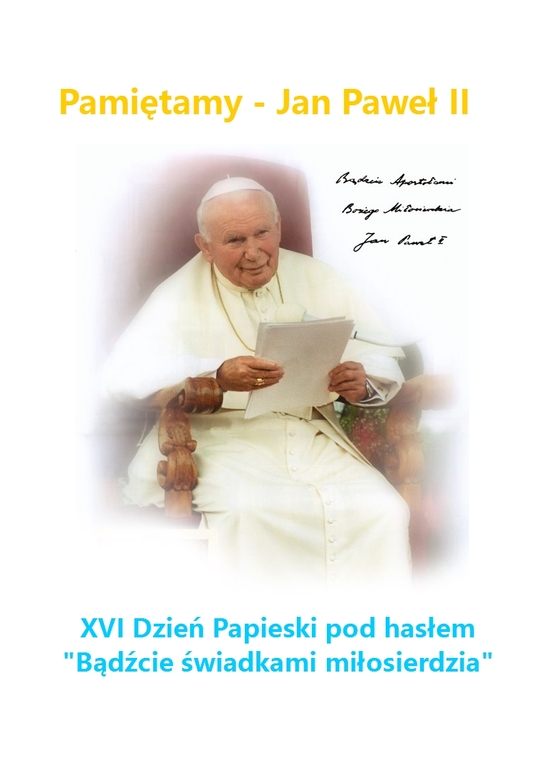XVI Dzień Papieski obchodzony jest pod hasłem „Bądźcie świadkami miłosierdzia!” Hasło to ma walor szczególnej aktualności w trwającym Nadzwyczajnym Roku Miłosierdzia ogłoszonym przez Papieża Franciszka. Rozwój i rozprzestrzenienie się kultu miłosierdzia dokonały się w dużej mierze dzięki osobistemu zaangażowaniu Jana Pawła II.