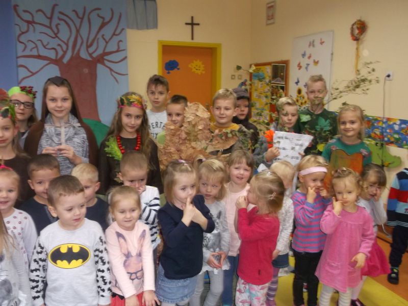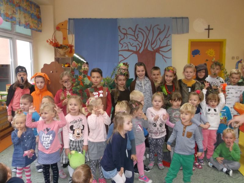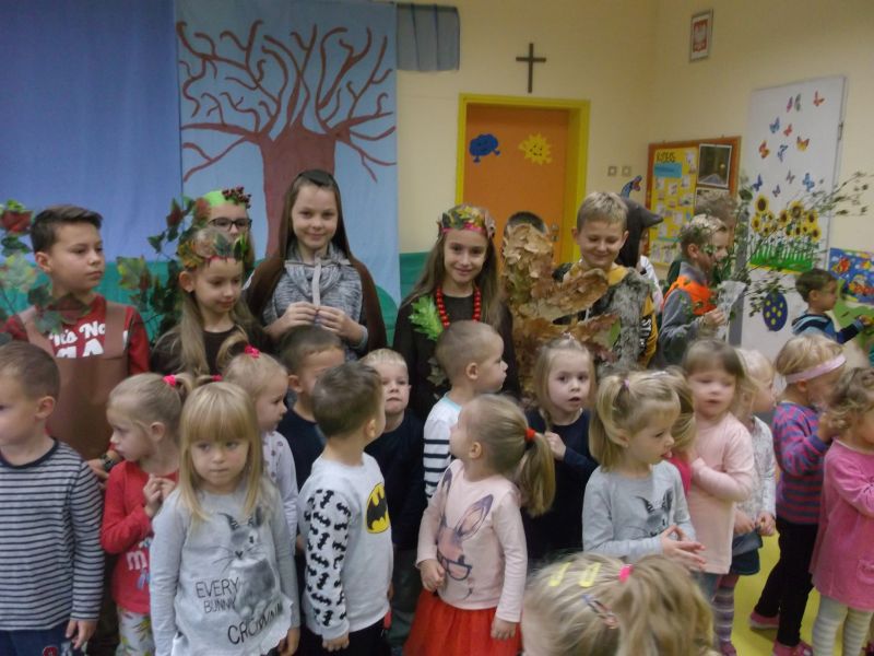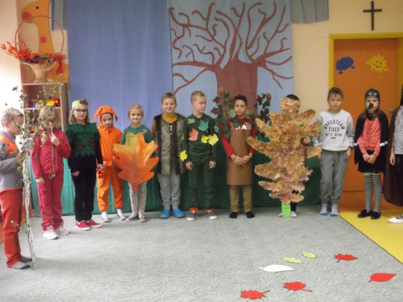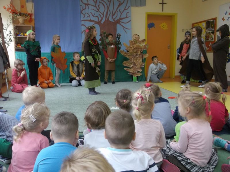 Dzieci z klasy III, przedstawiły najmłodszym przedszkolakom „Krasnoludkom” i „Muchomorkom” spektakl o polskiej złotej jesieni. Trzylatki z uwagą i zainteresowaniem obejrzały przedstawienie, a na zakończenie nagrodziły aktorów brawami na stojąco. Starsi koledzy goszcząc w naszym przedszkolu, powrócili do swoich wspomnień z tamtych lat, a wychowawcy mieli dużą radość gościć tak wspaniałych aktorów.