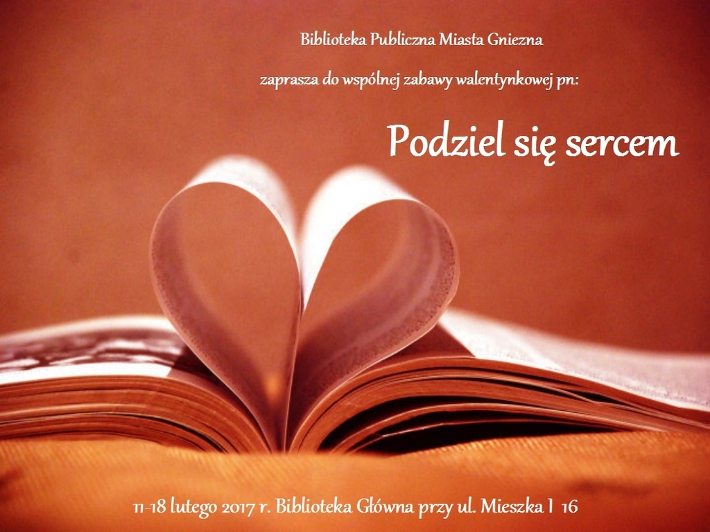Bibliotekarze Biblioteki Głównej (przy ul. Mieszka I 16) chcieliby zaprosić czytelników do świętowania walentynkowego zwyczaju i odwiedzenia książnicy między 11 a 18 lutego 2017 roku. W tym czasie będą polecać szczególnie lekturę, która ukoi złamane, stęsknione, czy zestresowane serca. Serdecznie zapraszamy.