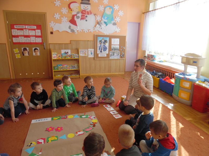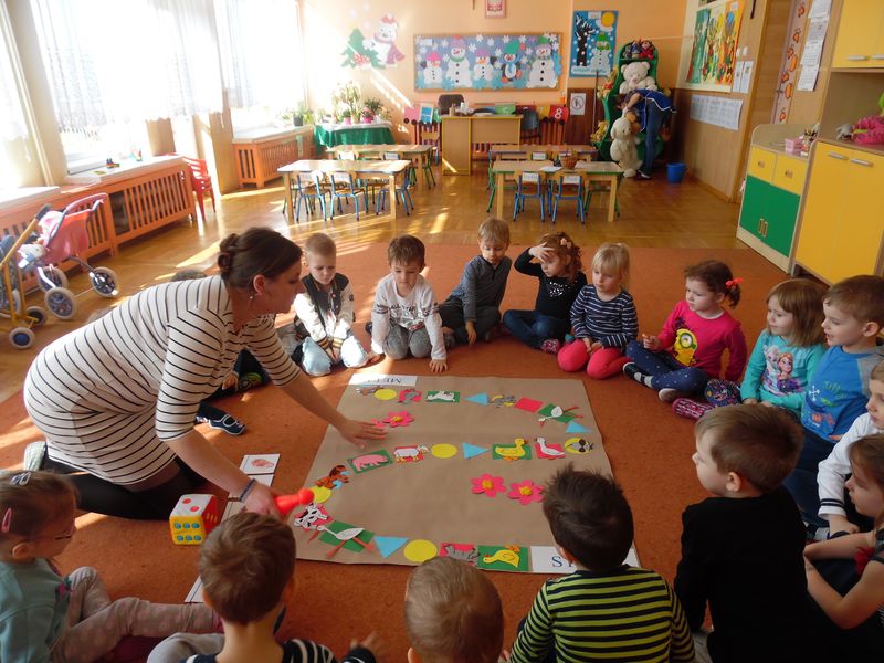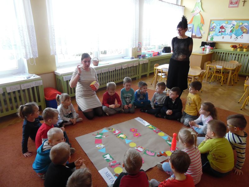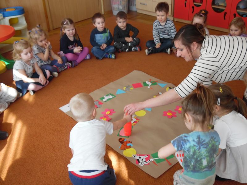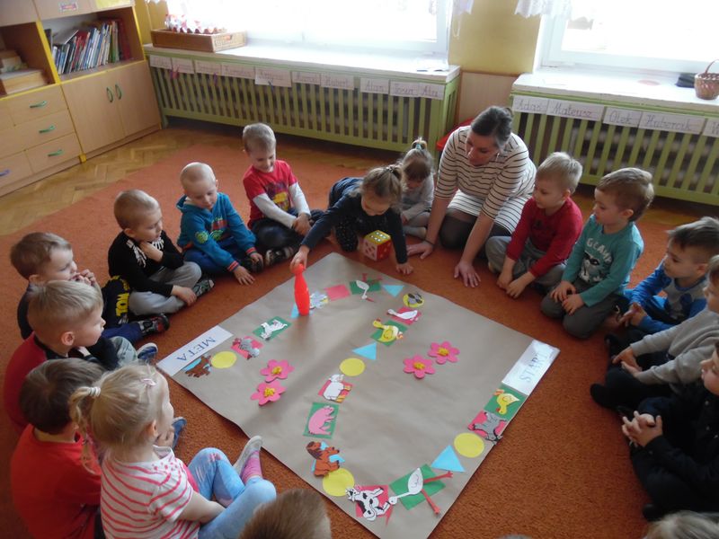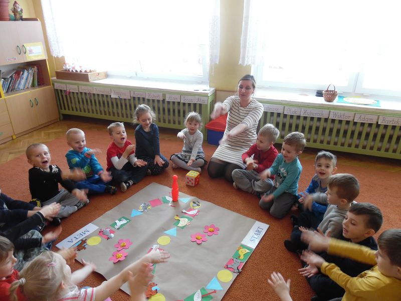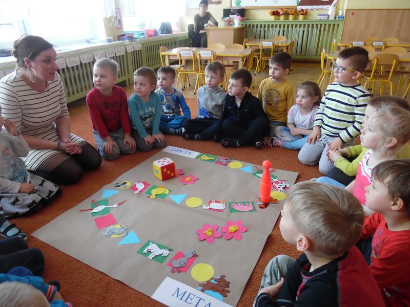 Dzieci dowiedziały się, co jest nam potrzebne, żeby pięknie mówić. Z niecierpliwością zekały także, aż rozpocznie się gra planszowa, podczas której była okazja, by naśladować głosem zwierzęta. Ta zabawa była wspaniałym pretekstem do usprawniania całego aparatu mowy: oddychania, fonacji (głos), prozodii (melodii, akcentu i rytmu mowy), słuchu fonematycznego oraz sprawności i koordynacji narządów mowy. Na koniec dzieci wykonały jeszcze słodką gimnastykę buzi i języka z cukierkiem.