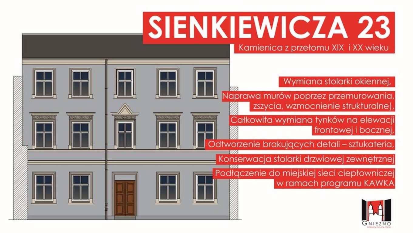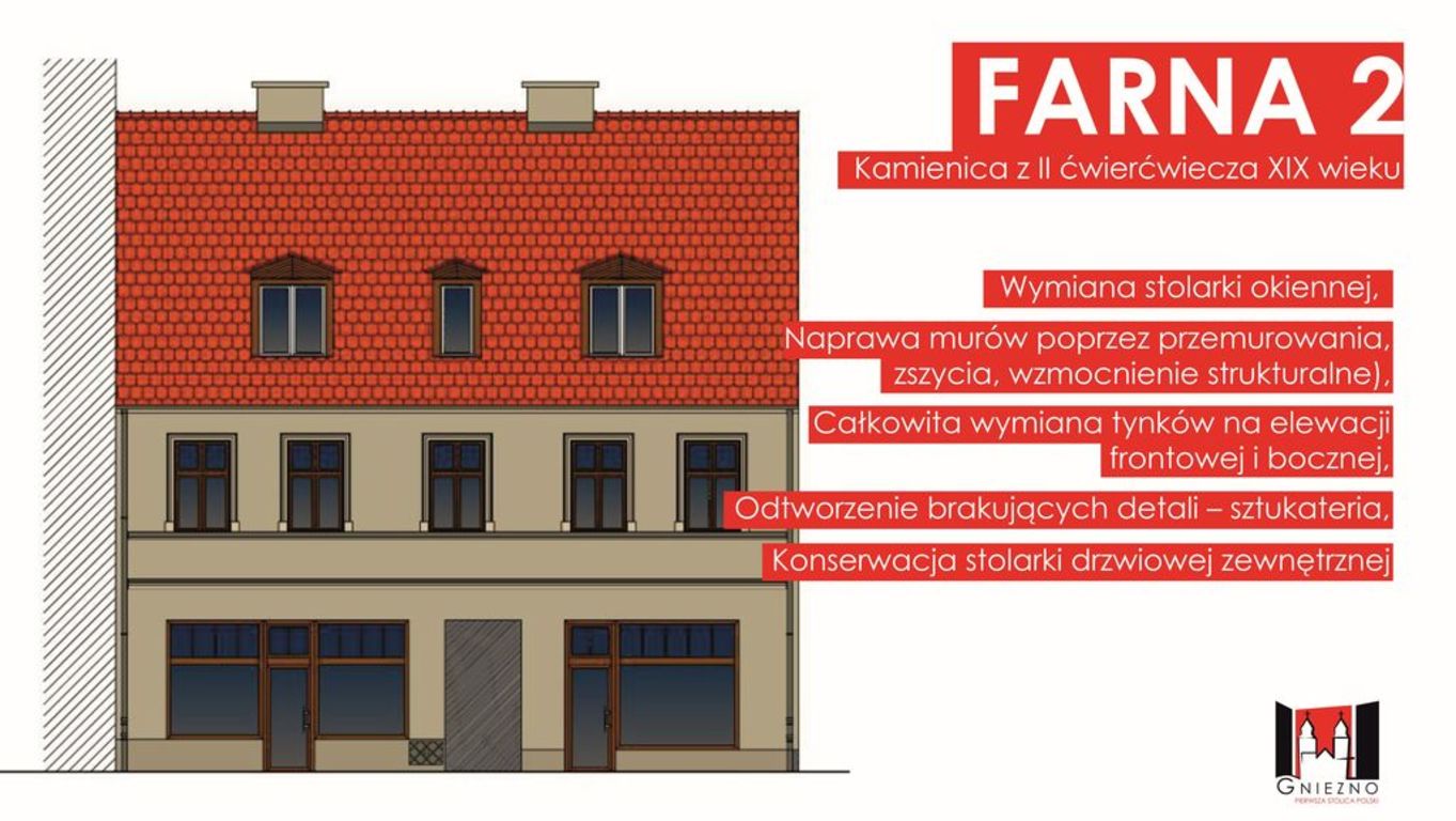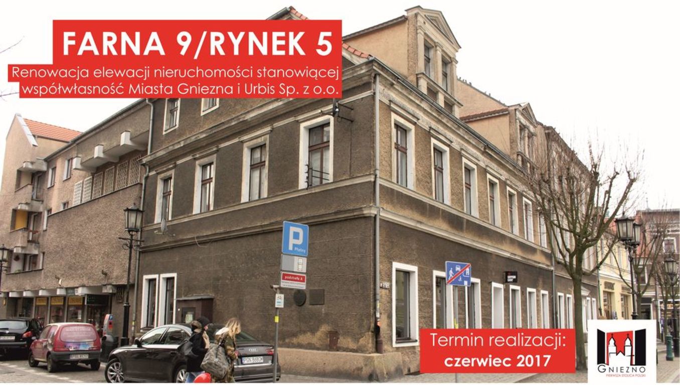 Wiosną tego roku rozpoczną się remonty kilku kamienic, których właścicielem jest Miasto Gniezno. W ramach tych remontów wymienione zostaną tynki, okna i drzwi i odtworzone zostaną sztukaterie. Renowacja obejmie 3 nieruchomości przy ul. Warszawskiej 16, Sienkiewicza 23 i Farnej 2. Kolorystyka remontowanych elewacji została uzgodniona z Miejskim Konserwatorem Zabytków. Budynek przy ul. Sienkiewicza zostanie także podłączony do miejskiej sieci ciepłowniczej. Do czerwca wykonana zostanie renowacja elewacji kamienicy przy ul. Farnej 9/Rynek 5, która stanowi współwłasność Miasta Gniezna