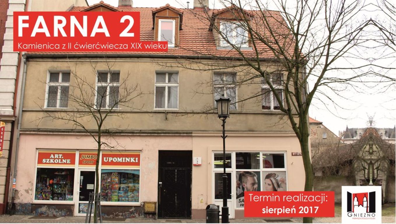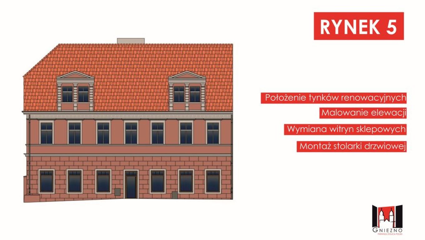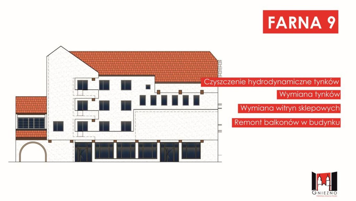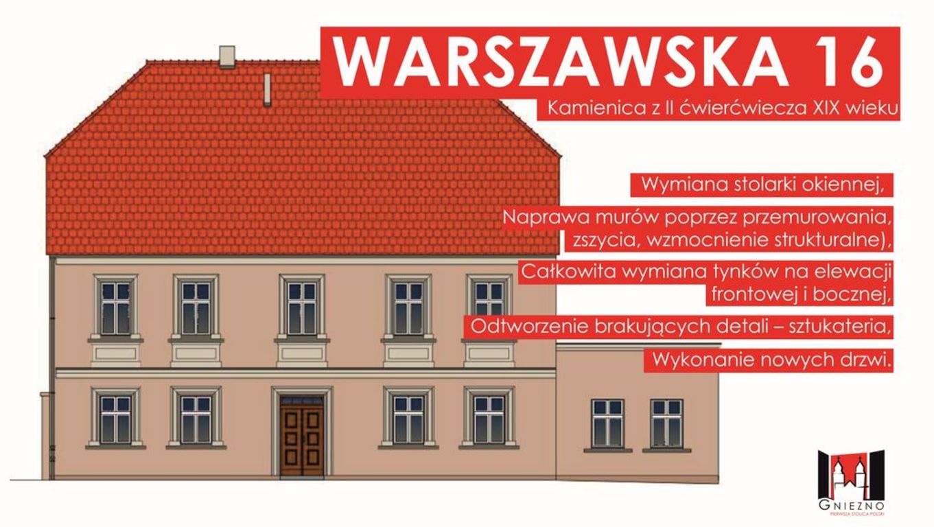 Wiosną tego roku rozpoczną się remonty kilku kamienic, których właścicielem jest Miasto Gniezno. W ramach tych remontów wymienione zostaną tynki, okna i drzwi i odtworzone zostaną sztukaterie. Renowacja obejmie 3 nieruchomości przy ul. Warszawskiej 16, Sienkiewicza 23 i Farnej 2. Kolorystyka remontowanych elewacji została uzgodniona z Miejskim Konserwatorem Zabytków. Budynek przy ul. Sienkiewicza zostanie także podłączony do miejskiej sieci ciepłowniczej. Do czerwca wykonana zostanie renowacja elewacji kamienicy przy ul. Farnej 9/Rynek 5, która stanowi współwłasność Miasta Gniezna