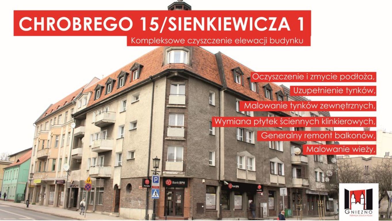 i spółki Urbis, która obejmie m.in. czyszczenie hydrodynamiczne tynków, wymianę tynków, wymianę witryn sklepowych oraz remont balkonów. W czerwcu 2017r kamienica przy ul. Chrobrego 15/Sienkiewicza będzie czyszczona,. Koszt czyszczenia to niespełna 100 tys zł. Także w tym roku rozpoczną się prace remontowo – konserwatorskie elewacji i ogrodzenia budynku Urzędu Miejskiego. Koniec prac przewidziany jest na czerwiec 2018 r.