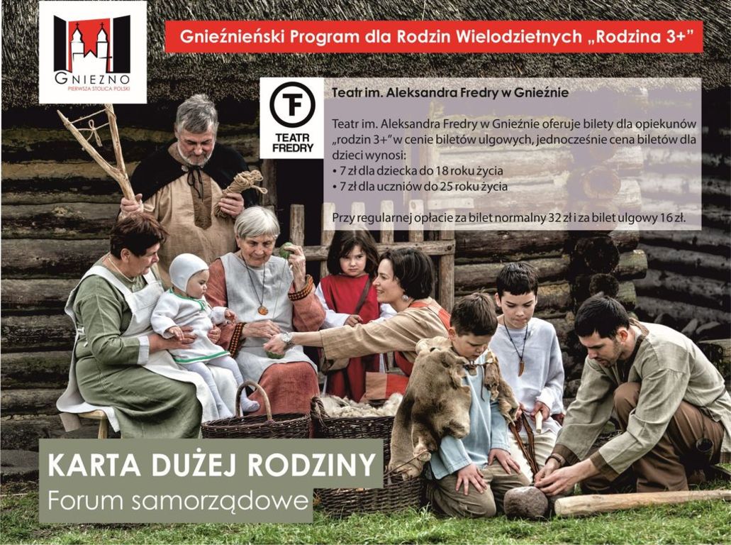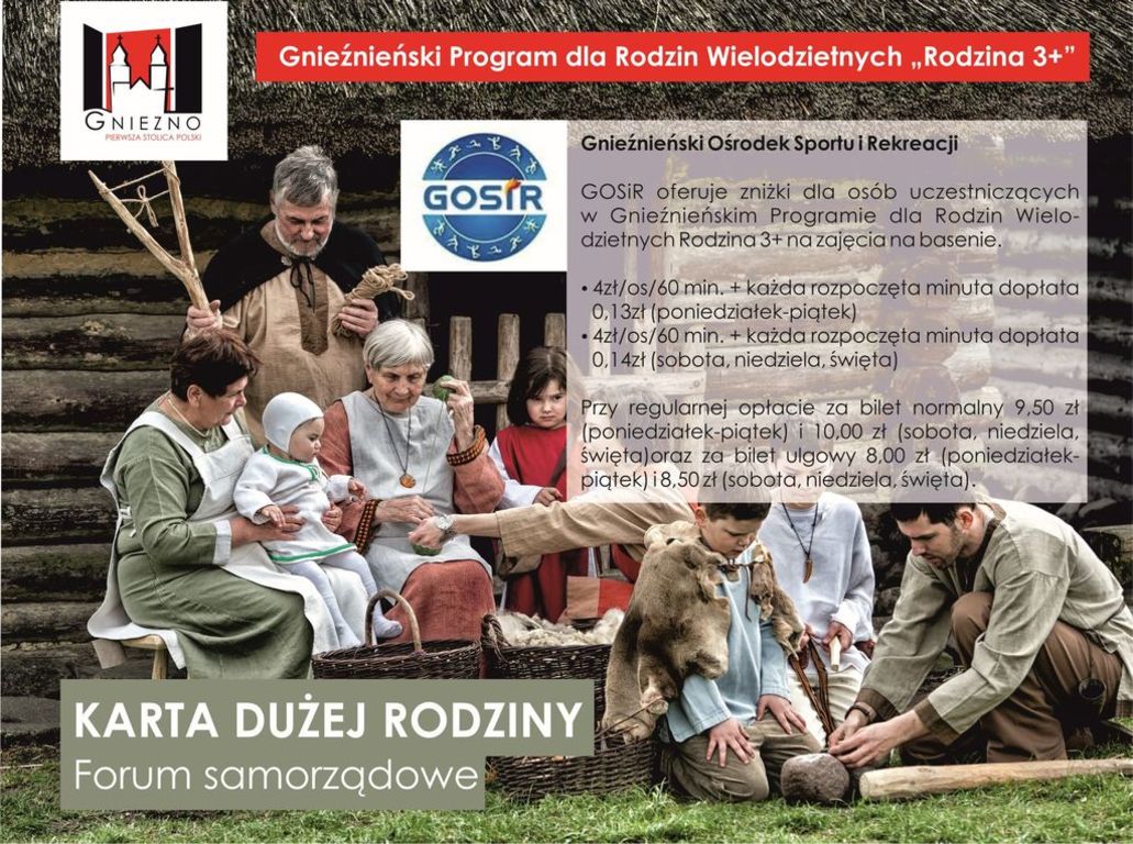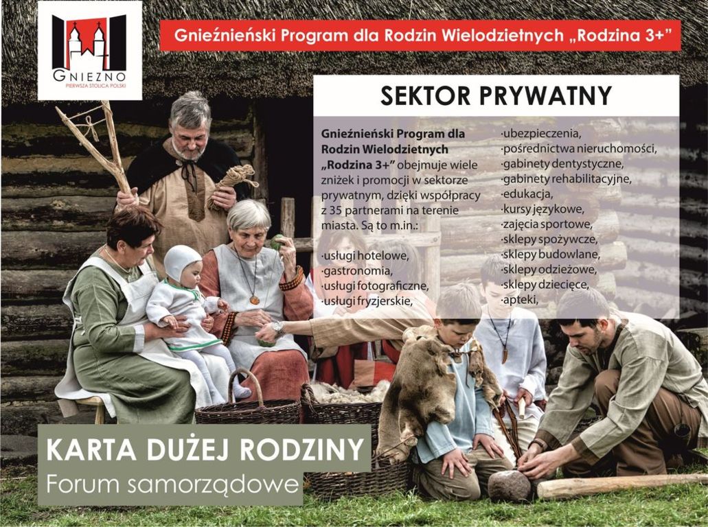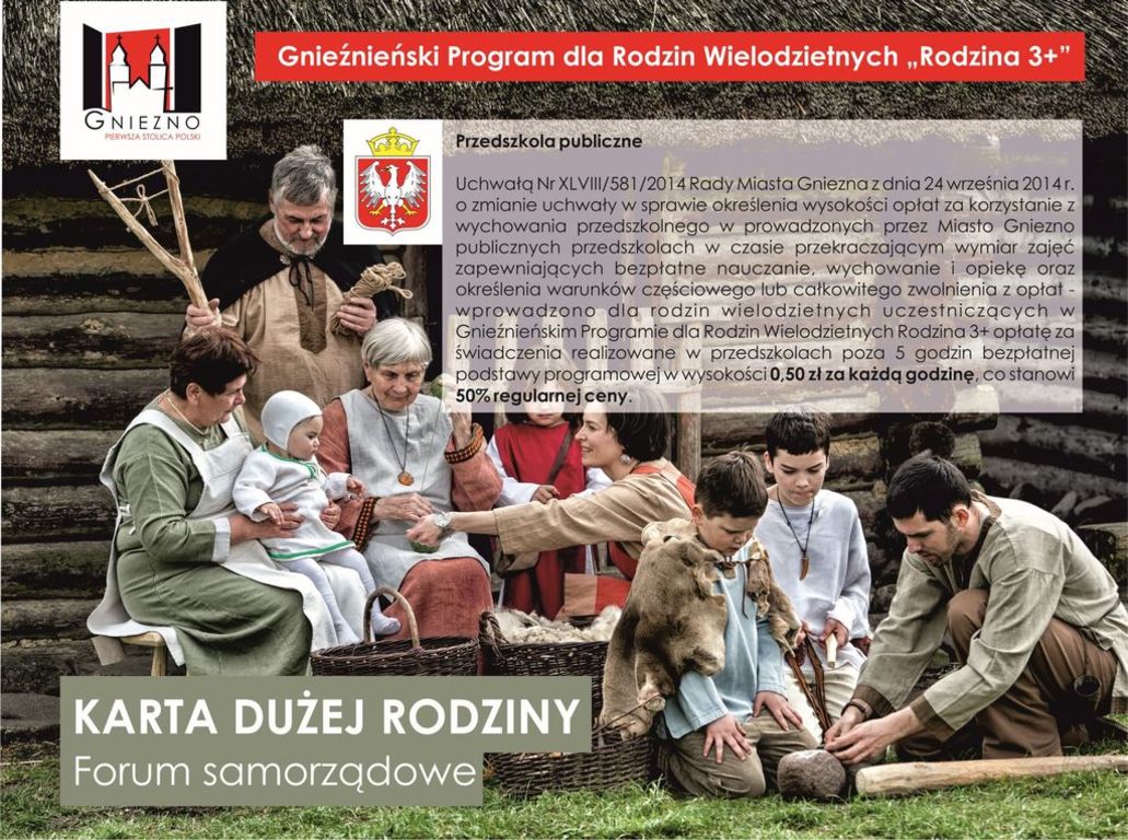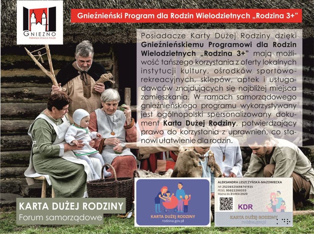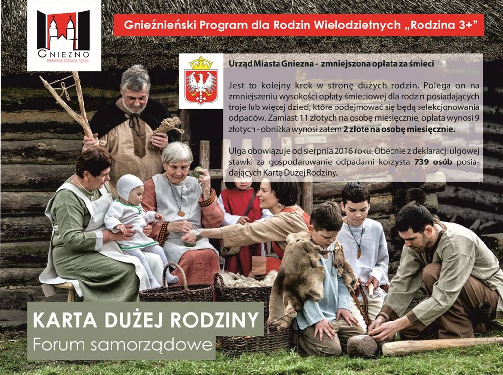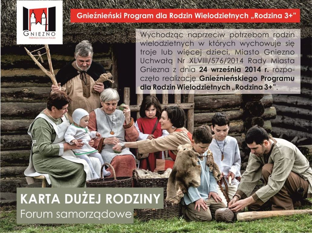 Miasto Gniezno realizuje Gnieźnieński Program dla Rodzin Wielodzietnych "Rodzina 3+". Uczestnicy programu, posiadacze specjalnej karty, mogą korzystać z licznych ulg i udogodnień.