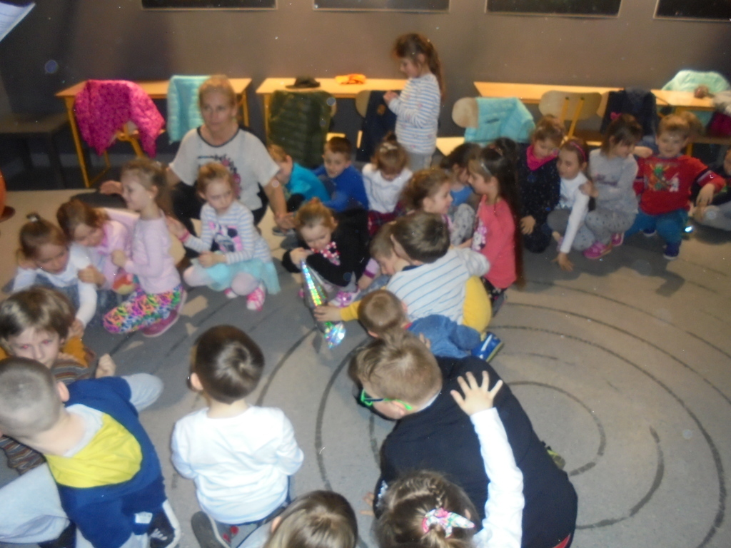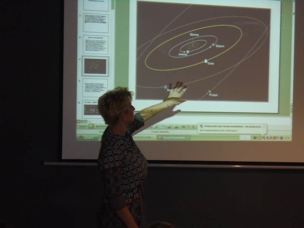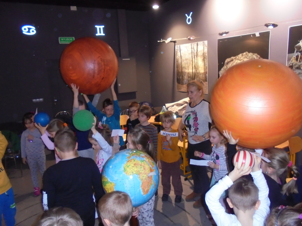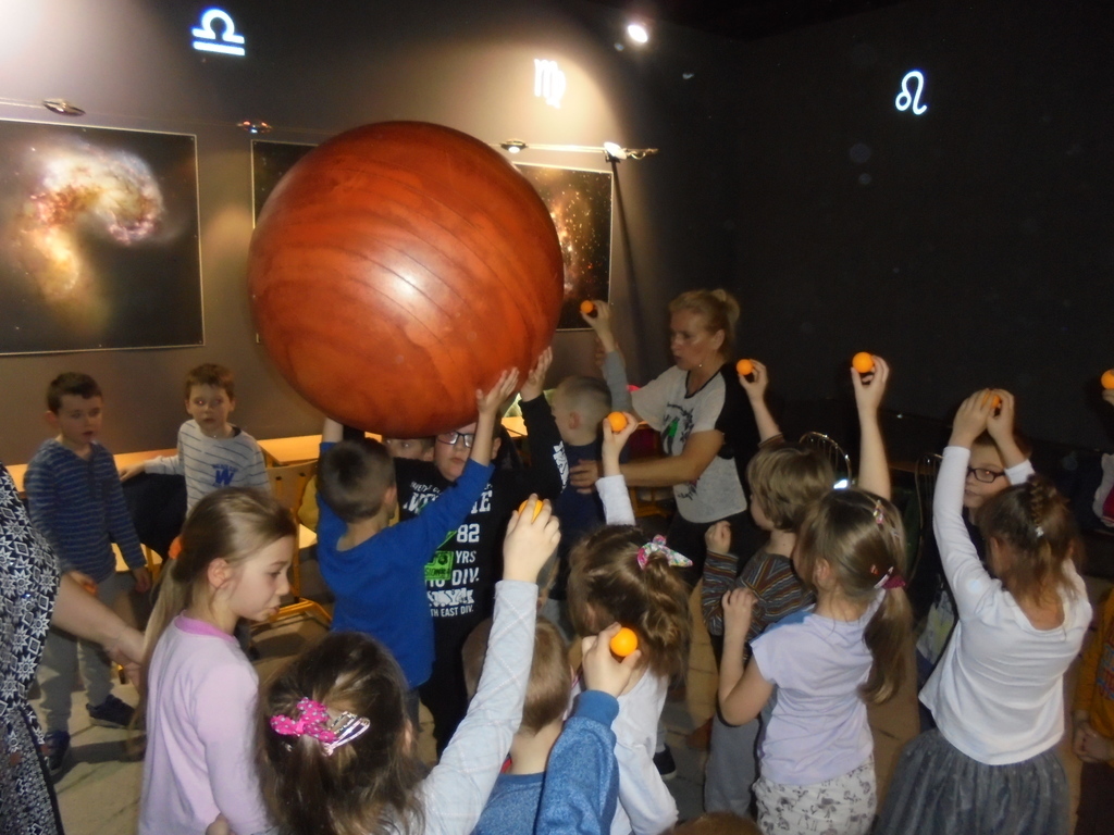 Nietypowy wystrój sali - gwiazdozbiory na ciemnym suficie, tęczowe plakaty obiektów astronomicznych i orbity na podłodze od samego początku wzbudzały zaciekawienie przedszkolaków. Warsztaty poprzedziła prezentacja multimedialna wzbogacająca i systematyzująca wiedzę dzieci na temat wszechświata. Następnie, podczas zabaw ruchowych za pomocą kolorowych piłek symbolizujących planety układu słonecznego przedszkolaki wyruszyły w kosmiczną podróż. Zabawy z ogromnym globusem i latarkami przybliżyły starszakom zmiany oświetlenia Ziemi w ciągu doby i podczas roku.