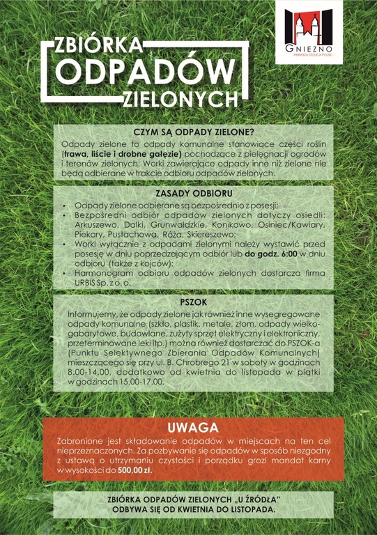 - Miasto Gniezna odbiera odpady zielone (trwa, liście) od właścicieli nieruchomości położonych na osiedlach domków jednorodzinnych objętych odbieraniem odpadów zielonych: Arkuszewo, Dalki, Grunwaldzkie, Konikowo, Osiniec/Kawiary, Piekary, Pustachowa, Skiereszewo przez uprawnionego przedsiębiorcę. Odbieranie odpadów zielonych będzie się odbywać w okresie od 1 kwietnia do 30 listopada w terminach przewidzianych harmonogramem wywozu, dostarczonym mieszkańcom. Do selektywnej zbiórki odpadów zielonych (trawa, liście) należy używać worków foliowych o pojemności do 120l, które właściciel nieruchomości zapewni we własnym zakresie;