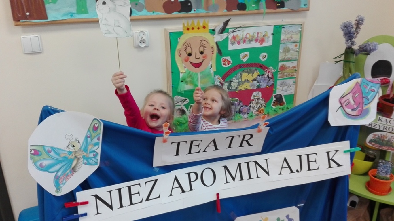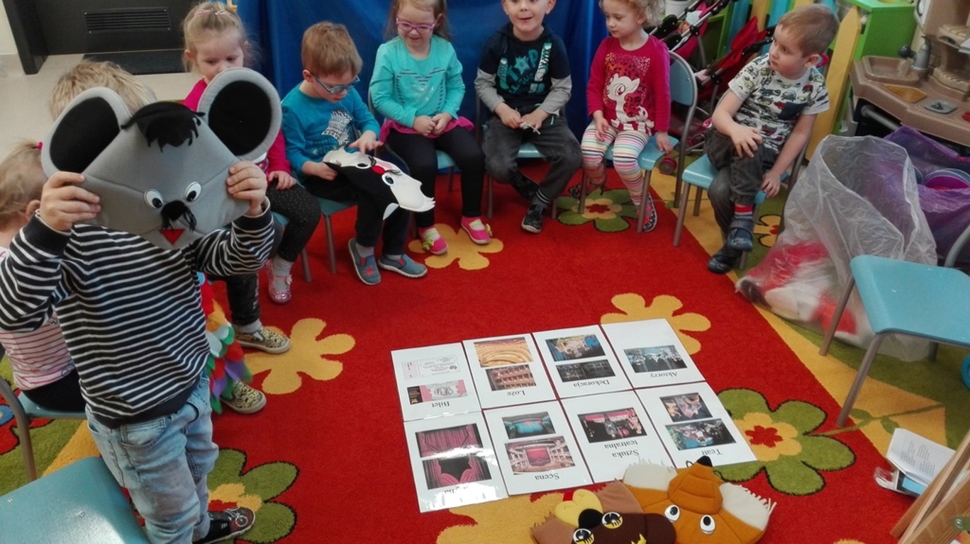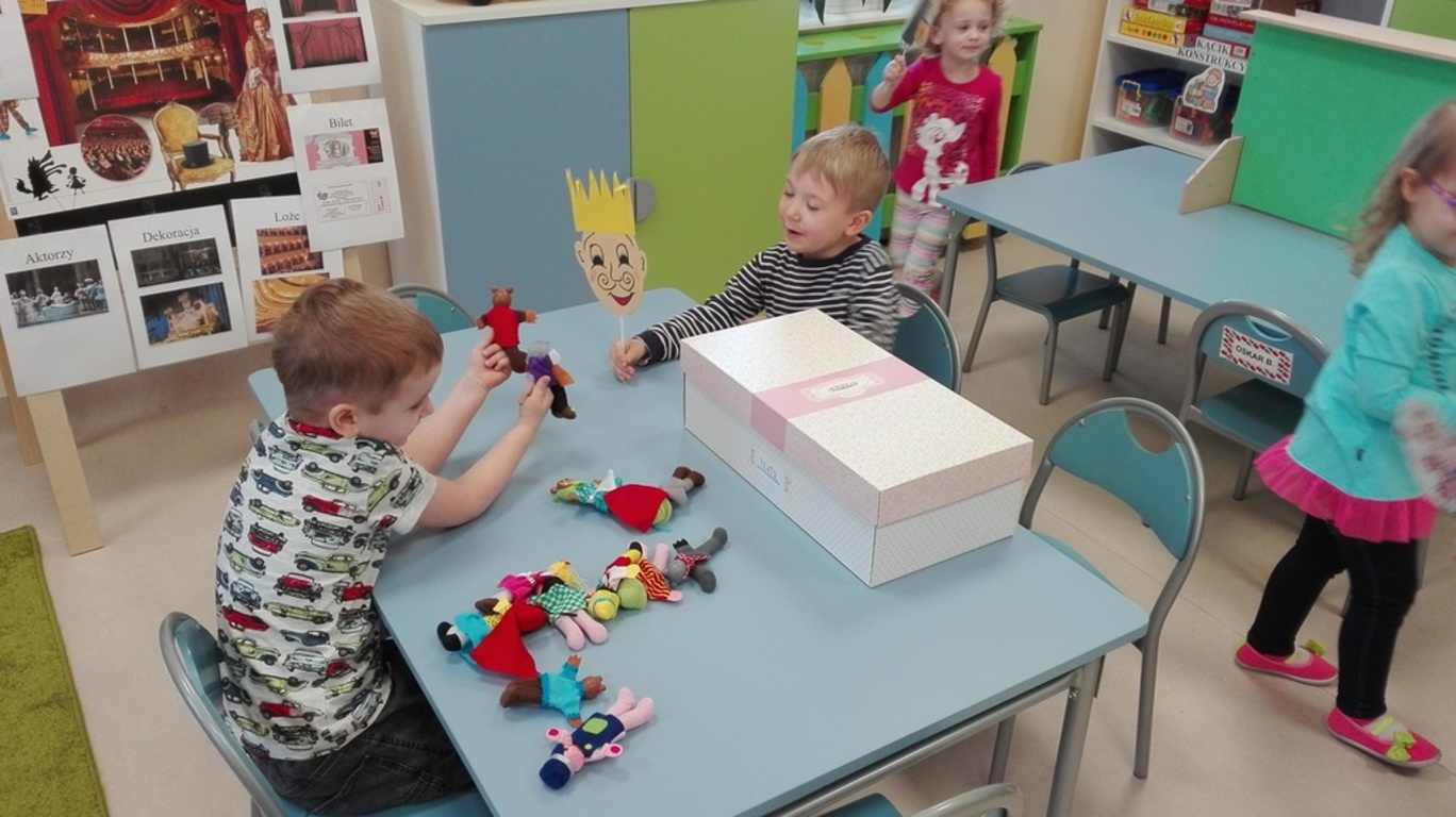 Przedszkolaki obejrzały zdjęcia teatru, a także rozwiązywały widowiskowe zagadki. Nauczycielka, pani Natalia, zaprezentowała dzieciom kukiełki, pacynki i marionetki, które dotykały i przekonywały się, z jakich materiałów można je wykonać. W magicznej atmosferze „Niezapominajki” wykonały dekoracje do „Teatru Niezapominajek”. Maluszki razem z wychowawcą stworzyły własny, przedszkolny teatrzyk. Przymierzając stroje dzieci przemieniały się w aktorów jak z bajki i występowały w grupowym teatrzyku.