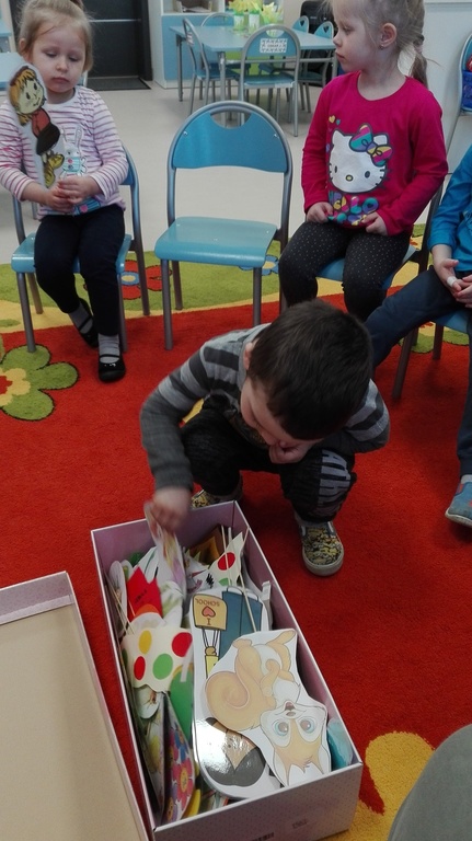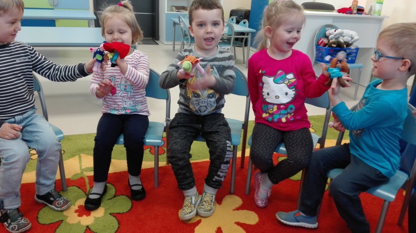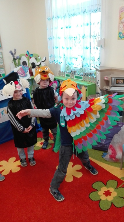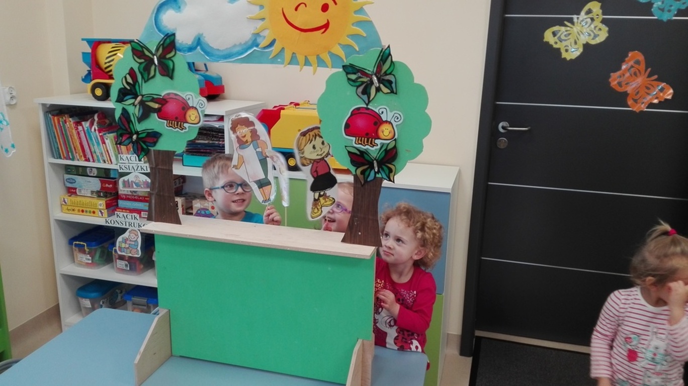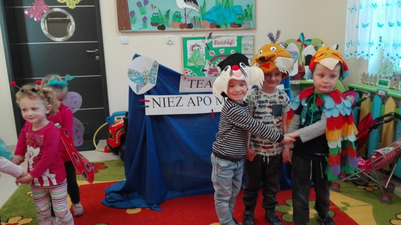Przedszkolaki obejrzały zdjęcia teatru, a także rozwiązywały widowiskowe zagadki. Nauczycielka, pani Natalia, zaprezentowała dzieciom kukiełki, pacynki i marionetki, które dotykały i przekonywały się, z jakich materiałów można je wykonać. W magicznej atmosferze „Niezapominajki” wykonały dekoracje do „Teatru Niezapominajek”. Maluszki razem z wychowawcą stworzyły własny, przedszkolny teatrzyk. Przymierzając stroje dzieci przemieniały się w aktorów jak z bajki i występowały w grupowym teatrzyku.