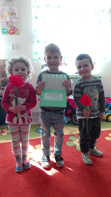 Dzieci przygotowały również kartkę okolicznościową dla wszystkich pracowników Teatru im. Aleksandra Fredry w Gnieźnie, którą wręczono Pani Dyrektor. Udział w przedstawieniach teatralnych stwarza dziecku możliwość twórczego, aktywnego działania. Promowanie zainteresowań teatrem wykształca w przedszkolakach nawyk uczestnictwa w życiu kulturalnym, rozwija wrażliwość estetyczną i zachęca do twórczej ekspresji. Przedszkolaki z „Polnych Kwiatów” w ramach repertuaru dla dzieci chętnie uczestniczą w spektaklach i zwiedzaniu kulis naszego pięknego teatru, a także zapraszają aktorów do przedszkola. W ten sposób kadra pedagogiczna w pełni realizuje innowację pedagogiczną „Przedszkolak widzem i aktorem” dla dzieci od lat 3.
