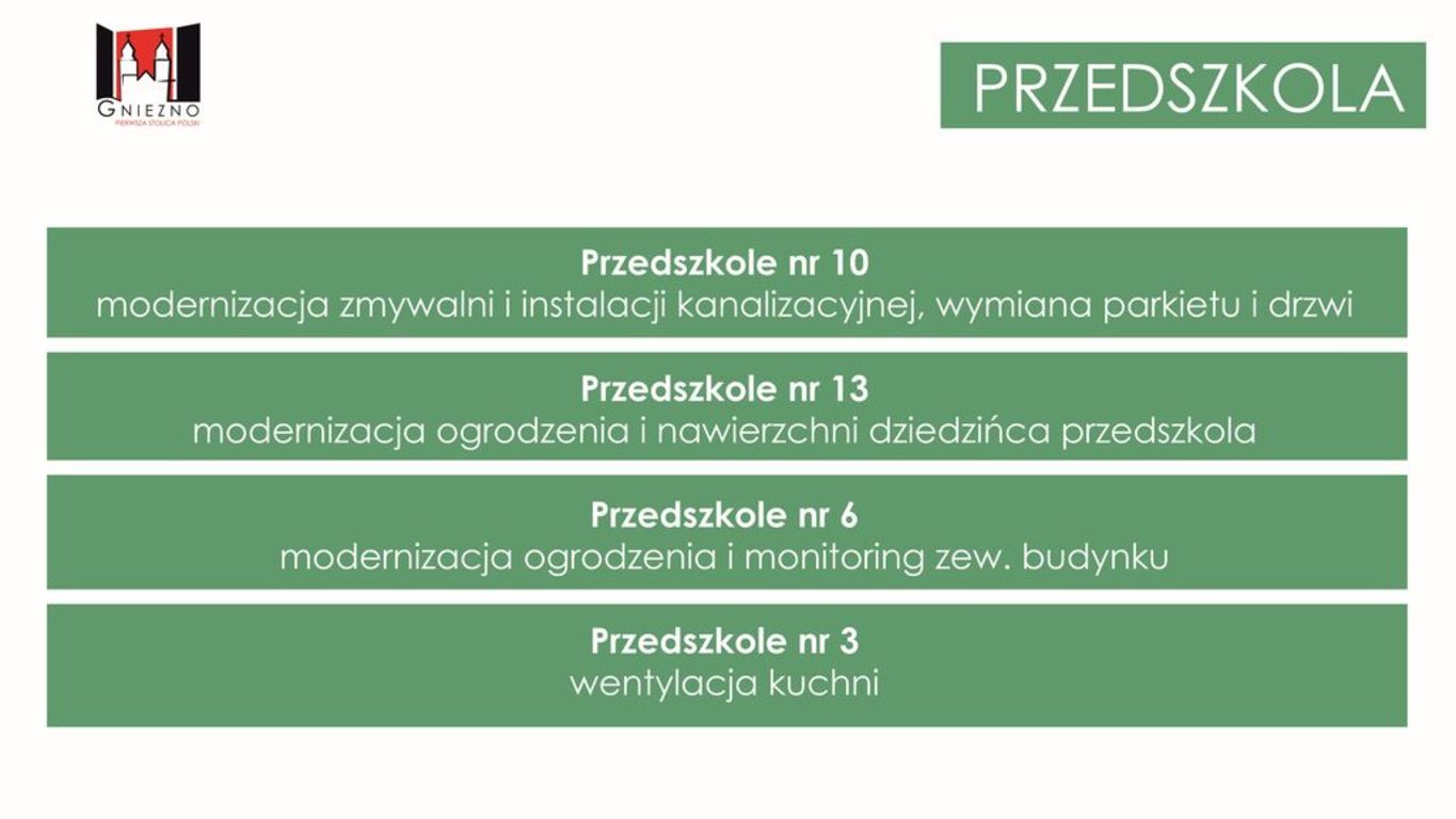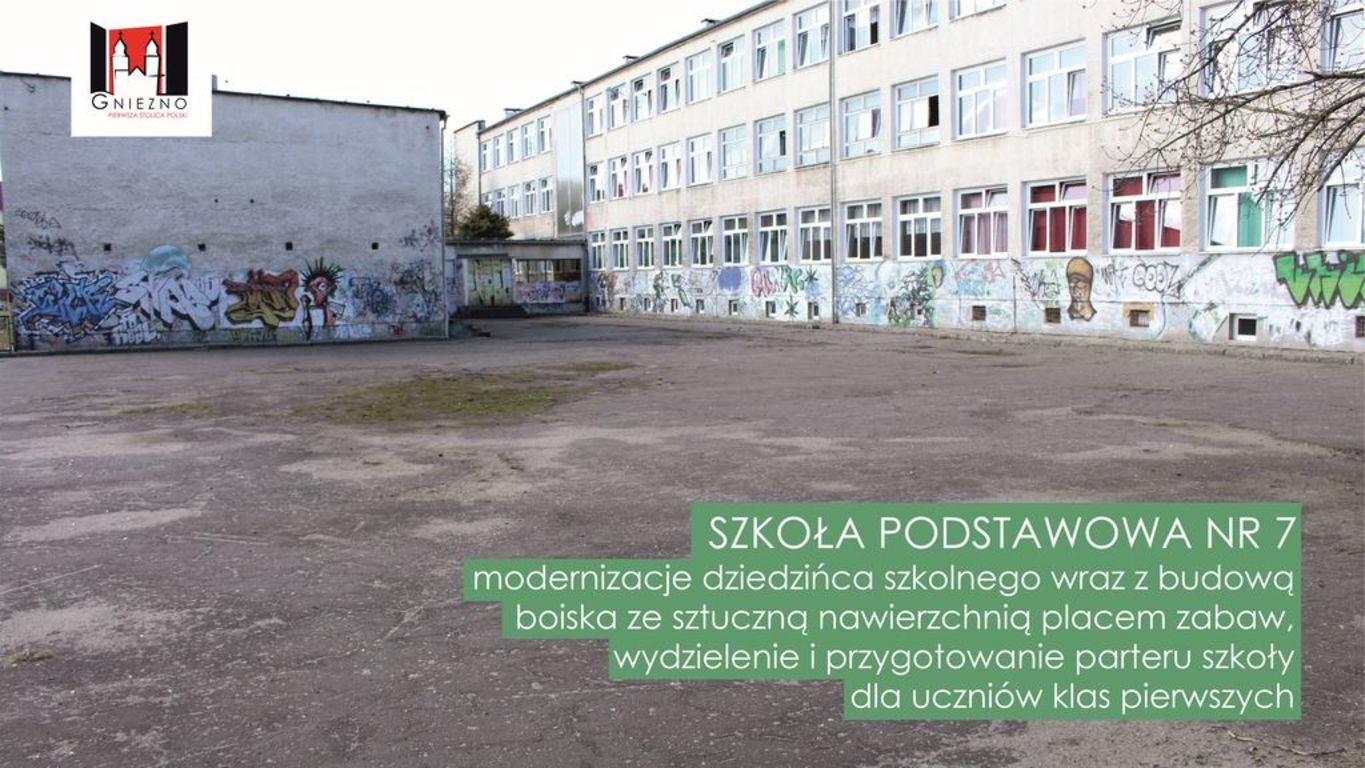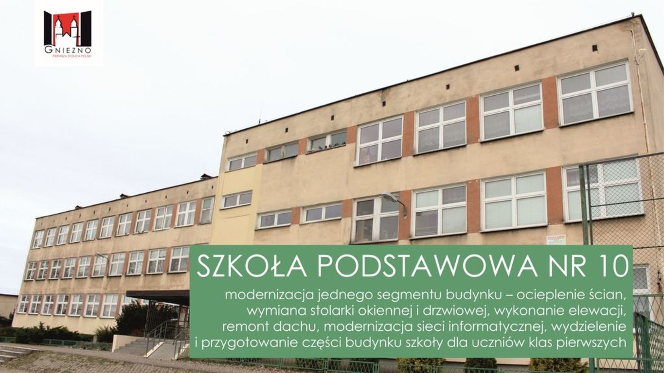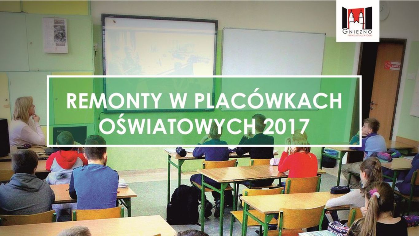 W tym roku Miasto Gniezno przeznaczy około 2 mln zł z miejskiego budżetu na remonty w placówkach oświatowych. To przede wszystkim przygotowanie dotychczasowych gimnazjów do przyjęcia siedmioletnich dzieci do pierwszych klas, budowa boisk, przygotwanie pracowni terminalowych, ale też remonty elewacji. W tym roku nastąpi to w Szkole Podstawowej nr 2 oraz w Szkole Podstawowej nr 6. Wyremontowane elewacje zostaną także wzbogacone o iluminację świetlną.