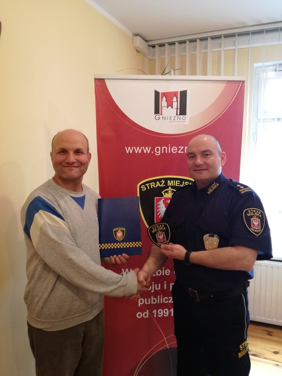 Pan Tomasz spotkał się ze Strażnikami w Gnieźnie. W niezwykle sympatyczny sposób zaprezentował skrupulatnie prowadzone pamiątkowe księgi, do których wpisują się włodarze oraz szefowie municypalnych. Na stronach ksiąg znaleźć można było zdjęcia prezydentów, burmistrzów, wójtów, komendantów, których Pan Tomasz dobrze znał, wycinki z gazet, wizytówki. Podczas wizyty w jednostce z Pierwszej Stolicy Polski Pan Tomasz zapoznał się z pracą strażników i otrzymał emblemat do swojej kolekcji.