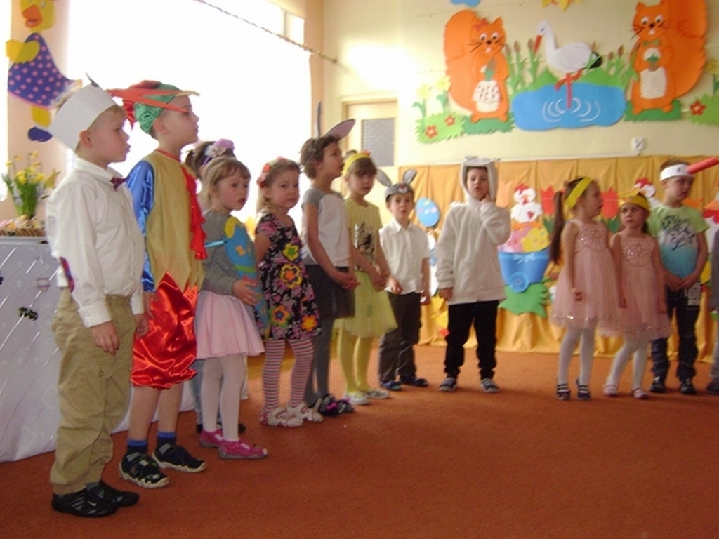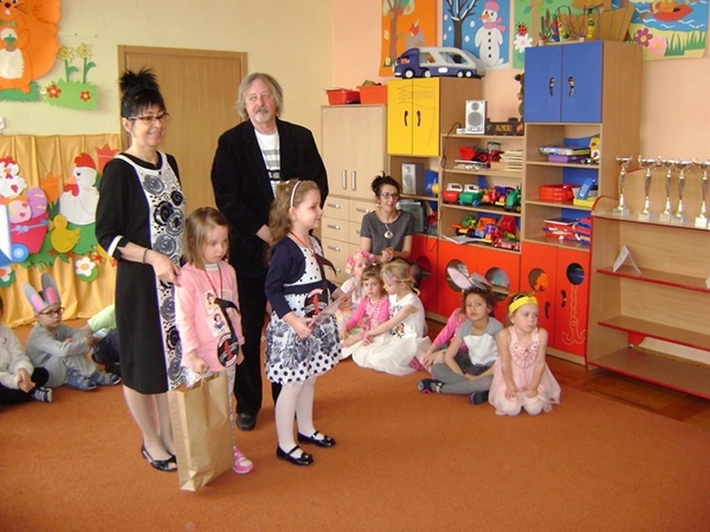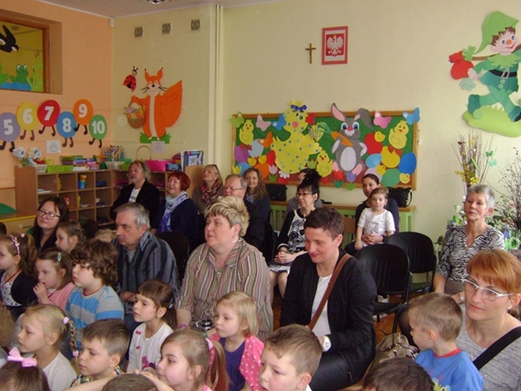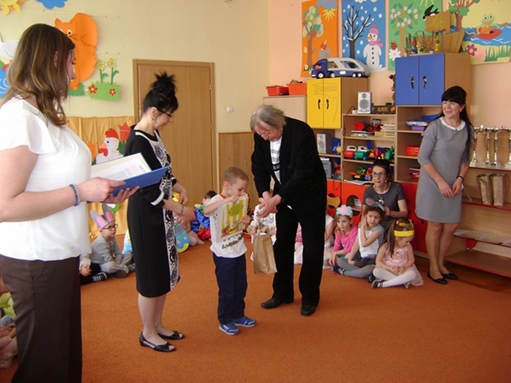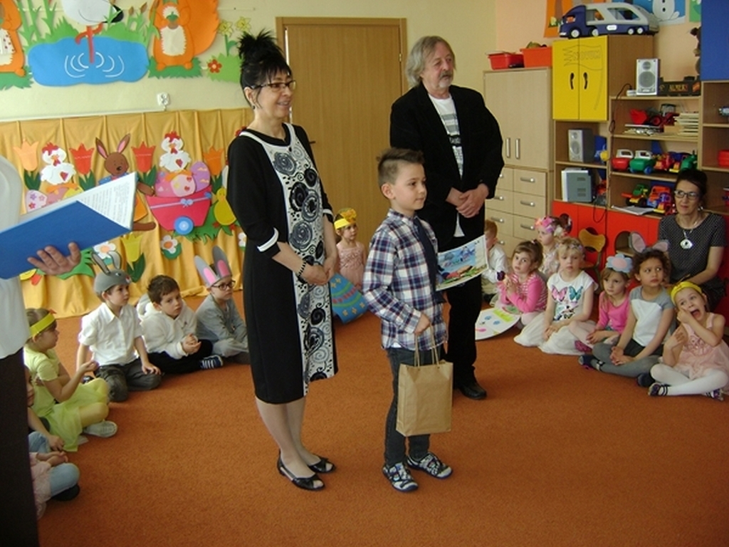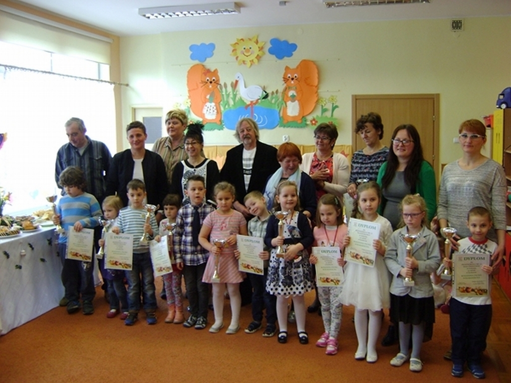 Następnie dzieci z grupy „Jeżyki” zaprezentowały część artystyczną „Wielkanocny koszyczek”, przypominając wszystkim zebranym gościom zwyczaje wielkanocne. Najważniejszym momentem spotkania było ogłoszenie wyników konkursu i wręczenie przez dyrektor przedszkola i Andrzeja Malickiego dyplomów, pucharów oraz upominków ufundowanych przez sponsorów. Podczas spotkania nie zabrakło ciepłych życzeń i smacznych potraw z wielkanocnego stołu poświęconych przez ks. kan. Jana Kasprowicza.
