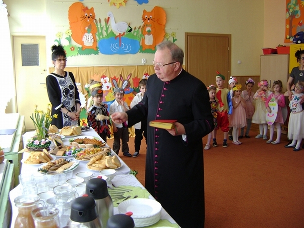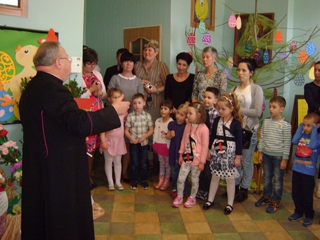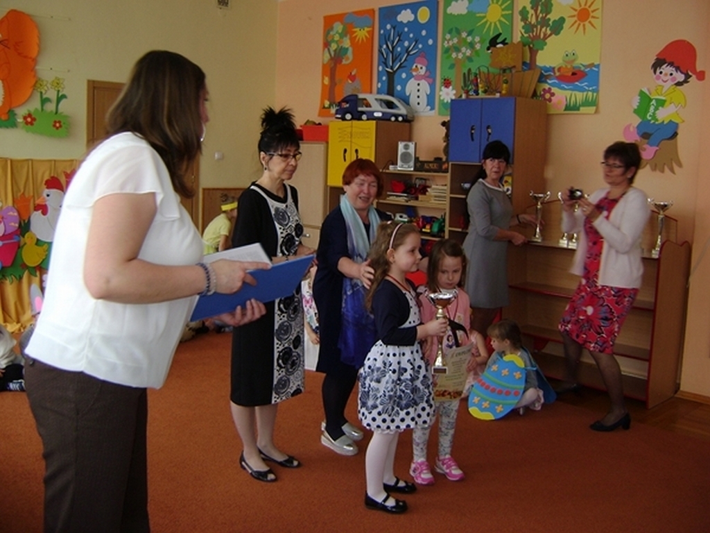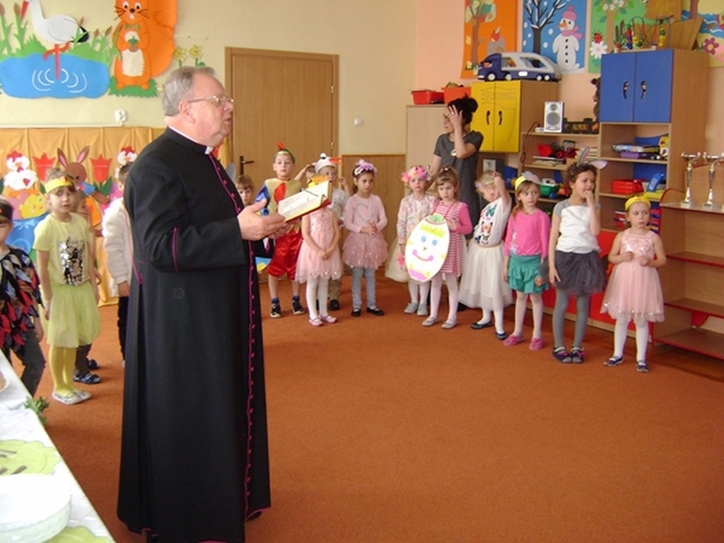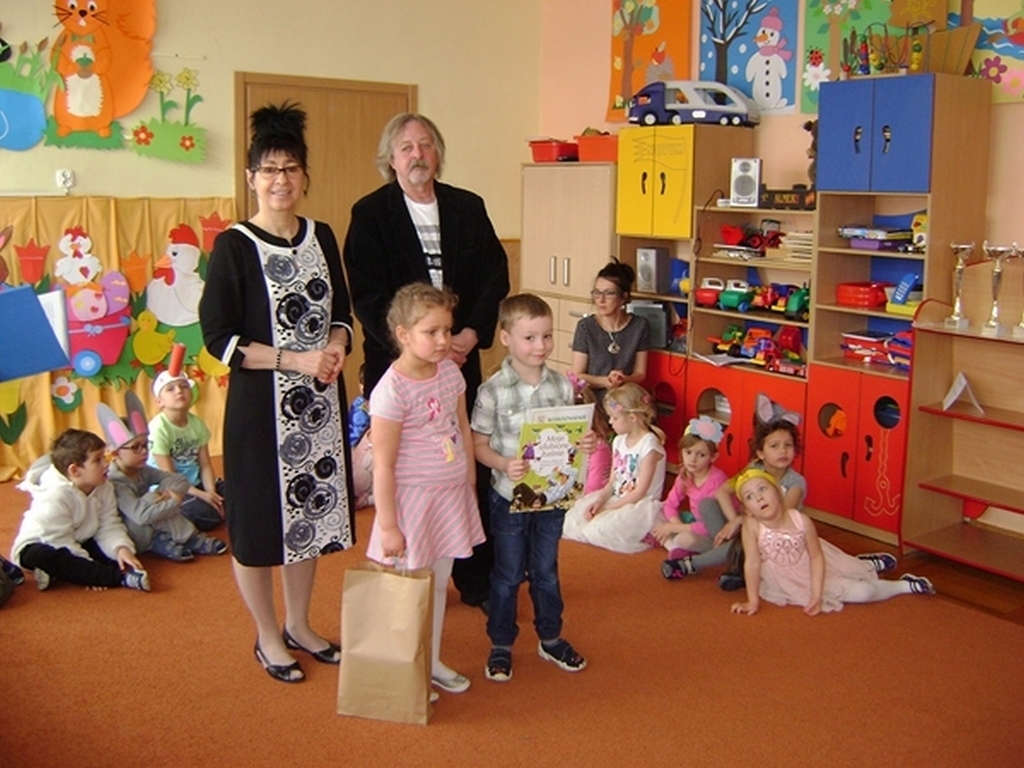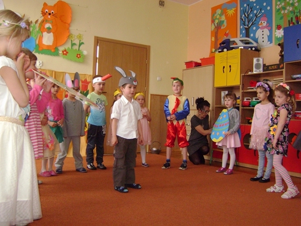 Następnie dzieci z grupy „Jeżyki” zaprezentowały część artystyczną „Wielkanocny koszyczek”, przypominając wszystkim zebranym gościom zwyczaje wielkanocne. Najważniejszym momentem spotkania było ogłoszenie wyników konkursu i wręczenie przez dyrektor przedszkola i Andrzeja Malickiego dyplomów, pucharów oraz upominków ufundowanych przez sponsorów. Podczas spotkania nie zabrakło ciepłych życzeń i smacznych potraw z wielkanocnego stołu poświęconych przez ks. kan. Jana Kasprowicza.