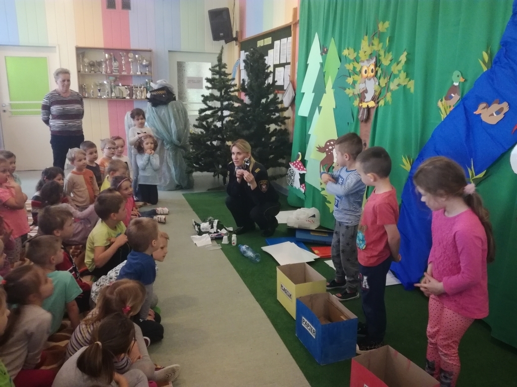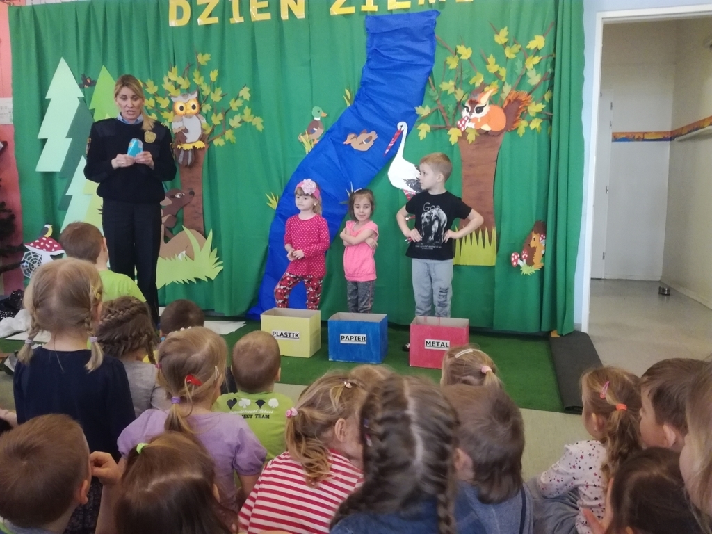 Zapoznano dzieci z zasadami segregowania śmieci oraz skutkami zanieczyszczenia środowiska, jakie może spowodować niewłaściwa gospodarka odpadami. Przedszkolaki bardzo chętnie uczestniczyły w zabawie i wykazywały się dużą znajomością zasad segregacji śmieci, jakie obowiązują w naszym mieście.