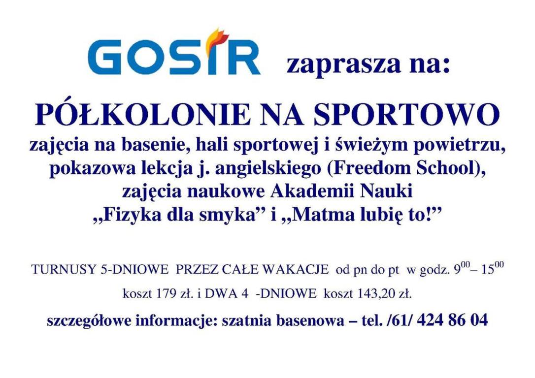 Gnieźnieński Ośrodek Sportu i Rekreacji zaprasza do udziału w półkoloniach „na sportowo”, które odbywać się będą w pięciodniowych turnusach (od poniedziałku do piątku) przez cały okres wakacji letnich. Zajęcia będą prowadzone w godzinach od 9.00 do 15.00 na terenie Kompleksu Rekreacyjno-Sportowego GOSiR przy ul. Bł. Jolenty 5. Każdego dnia dzieci otrzymają 2 posiłki (śniadanie i obiad).