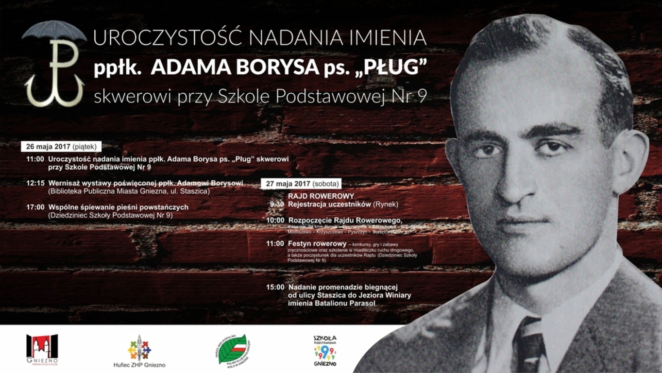 Niespełna rok temu prezydent Tomasz Budasz, podczas rocznicy wybuchu Powstania Warszawskiego zadeklarował kombatantom i harcerzom, że pamięć ppłk Adama Borysa „Pługa” będzie uczczona. Tak też się stanie. Patriotyczne uroczystości organizowane przez Urząd Miejski, Szkołę Podstawową nr 9 oraz hufiec ZHP Gniezno rozpoczną się w piątek 26 maja o godz. 11:00 uroczystością nadania imienia ppłk. Adama Borysa ps. „Pług” skwerowi przy Szkole Podstawowej nr 9. – Czyny, jakimi wsławił się dla naszego kraju ppłk Adam Borys, mają dla nas, osób o nim pamiętających, ogromną wartość. Poprzez nadanie imienia skwerowi, chcemy przede wszystkim utrwalić pamięć o tym niezwykłym człowieku. Miejsce, które chcemy nazwać jego imieniem nie jest przypadkowe. Obok niego znajduje się szkoła. Poprzez kultywowanie historii o bohaterach z czasów II Wojny Światowej pragniemy na stałe wpisać się w świadomość uczniów wzorce, które warto naśladować – mówi Michał Powałowski, zastępca prezydenta Gniezna, pomysłodawca uroczystości. Również w piątek o godz. 12:15 odbędzie się wernisaż wystawy poświęconej ppłk. Borysowi w Bibliotece Publicznej przy ul. Staszica, a po południu o godz. 17:00 na dziedzińcu SP 9 odbędzie się wspólne śpiewanie pieśni patriotycznych, na które zaproszeni są wszyscy mieszkańcy Gniezna.