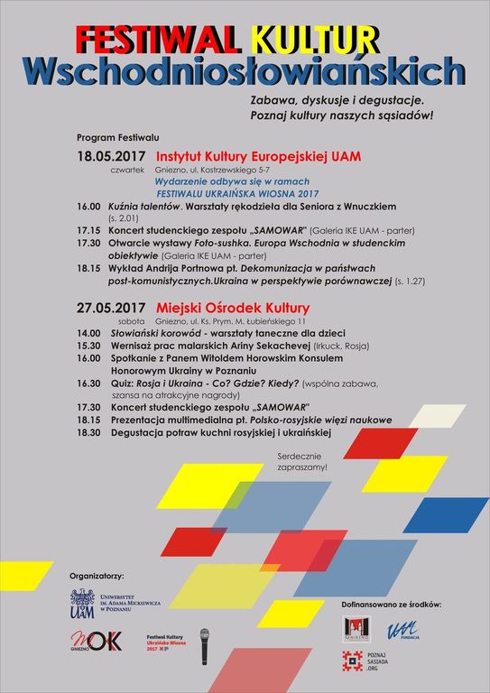 17.30 Koncert studenckiego zespołu „Samowar” – Zespół tworzony jest przez studentki i studentów Instytutu Kultury Europejskiej UAM. Po raz pierwszy zespół "Samowar" wystąpił na scenie koncertu wigilijnego w IKE w 2013 roku. Rosyjska ludowa piosenka "Święty wieczór", zaśpiewana przez studentek z Rosji zrobiła furorę. Od tego dnia rozpoczęła się historia zespołu. Zespół "Samowar" był zaproszony z występem do liceów oraz gimnazjów. A w roku 2014 pojawił się pomysł zorganizowania koncertu ludowej muzyki słowiańskiej w ścianach Instytutu Kultury Europejskiej. Do zespołu się dołączyły studenci z Ukrainy oraz Polski. Od tego momentu zespół śpiewa w trzech językach: rosyjskim, ukraińskim oraz polskim, pokazując piękno kultur swoich narodów. W kwietniu 2014 roku zespół "Samowar" został zaproszony przez władze miasta na festiwal "Radości" w centrum Gniezna. A dzisiaj uczestniki zespołu podzielą się swym talentem z wami, tradycyjnie zaczynając swój występ piosenką, od której się rozpoczęła historia zespołu "Samowar".