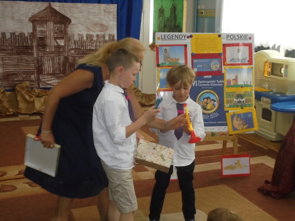Program imprezy był bardzo bogaty; od czytania fragmentów legend przez dorosłych jej uczestników, a także dzieci potrafiących już samodzielnie czytać, aż po różnorodne zadania, które musiały wykonać przedszkolaki: rozwiązywanie zagadek, odgadywanie tytułów legend, czy też układanie rozsypanki cyfrowo-literowej na temat znanych, legendarnych postaci. W programie uroczystości znalazło się też miejsce na czytanie podań w języku angielskim oraz rozpoznawanie i nazywanie rekwizytów i ich angielskich odpowiedników - zadań tych chętnie podjęły się dzieci pod kierunkiem Natalii Wilczyńskiej i Iwony Zarębskiej-Naplocha.