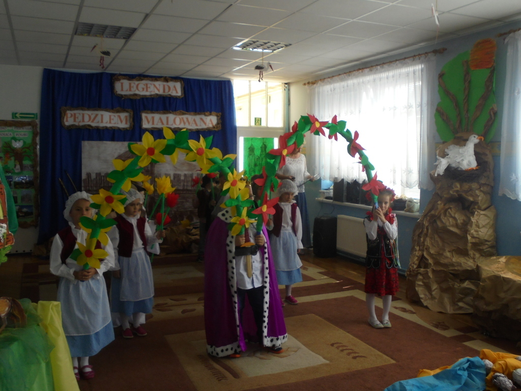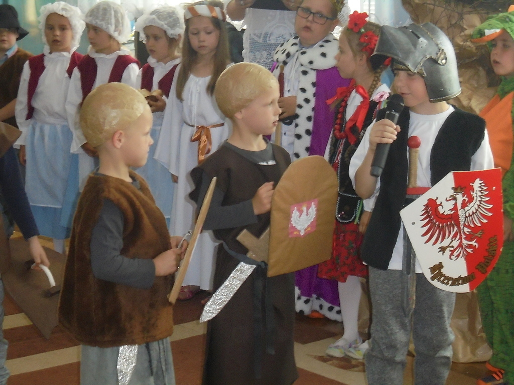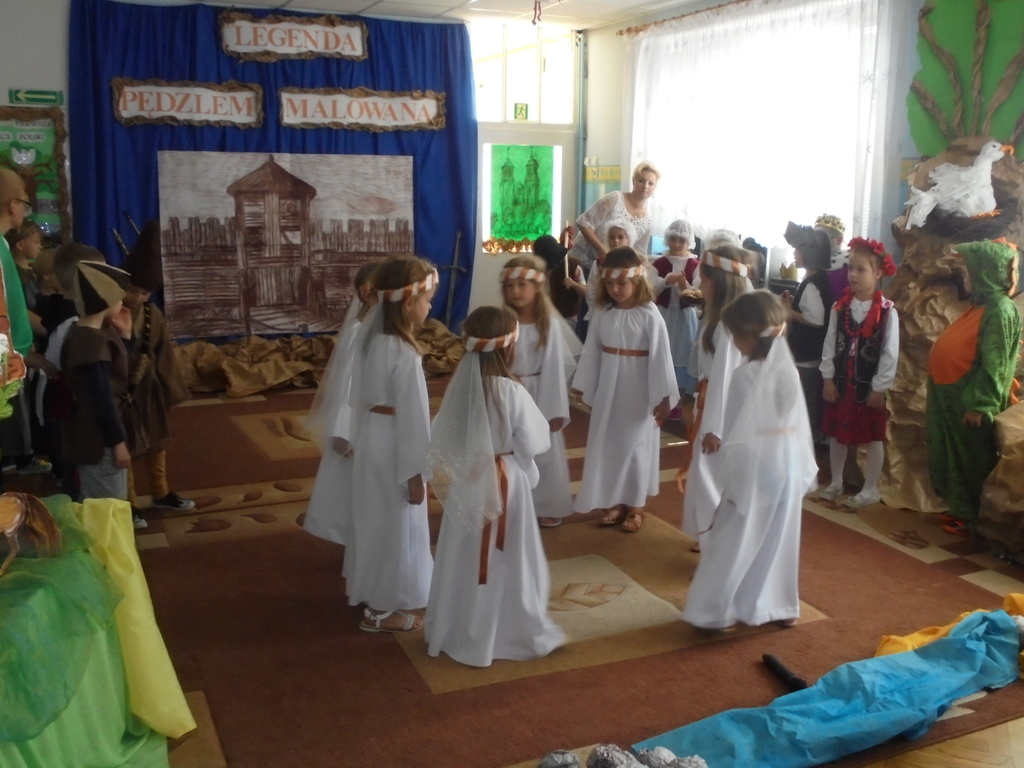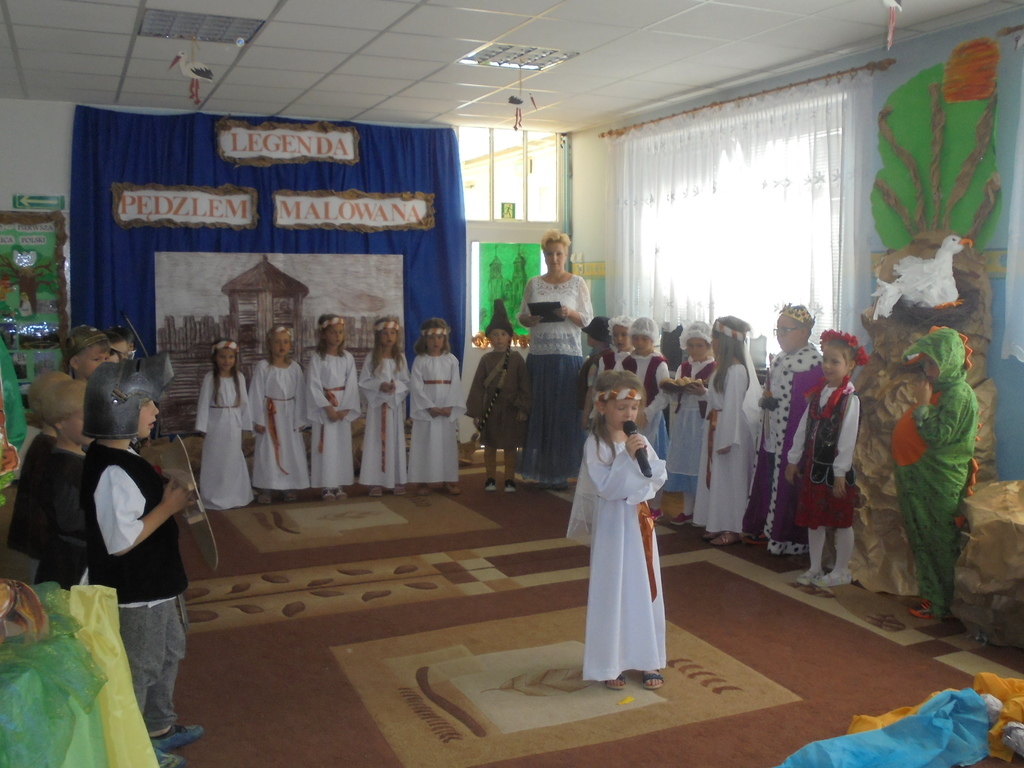 Zebrane dzieci, ich opiekunów oraz zaproszonych gości: Dyrektora Wydziału Edukacji UM Mariana Pokładeckiego, Kierownika Biblioteki Publicznej Urszulę Piątyszek, Prezesa Klubu Nauczycieli Polskich i Polonijnych Małgorzatę Tomczak, Radnego Rady Miasta Gniezna Ryszarda Karmolińskiego, emerytowaną dyrektor Przedszkola nr 6 Leokadię Mikułę powitała dyrektor Przedszkola nr 6 Mariola Ilnicka i zaprosiła do obejrzenia oraz wysłuchania inscenizacji „Dawno, dawno temu…” w wykonaniu dzieci z oddziału III „Bławatki” pod kierunkiem nauczycielki Barbary Pisarek. Starannie dobrana dekoracja, stroje i rekwizyty aktorów sprawiły, że widzowie z przedstawienia mogli dowiedzieć się wielu ciekawych rzeczy o korzeniach i historii naszego państwa. Następnie dzieci uczestniczące w konkursie przeszły „w plener” do sztalug i po wysłuchaniu krótkiego komentarza plastyczki Basi Pisarek przystąpiły do pracy. Powstały piękne, ekspresyjne obrazy opowiadające o dawnych czasach.