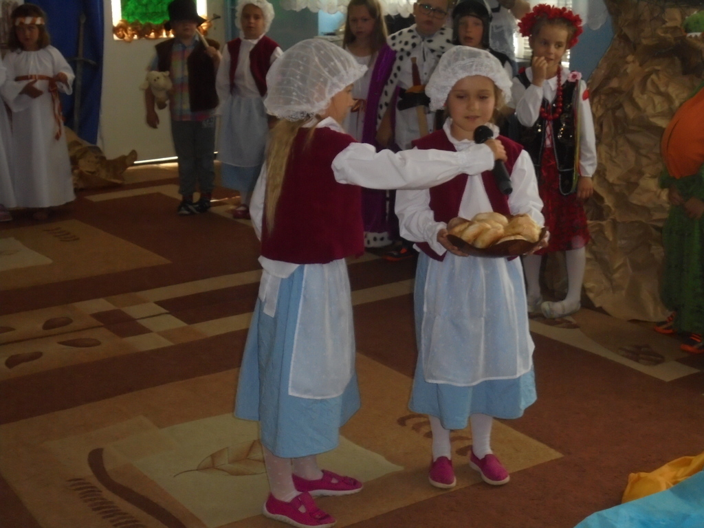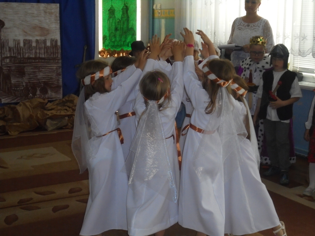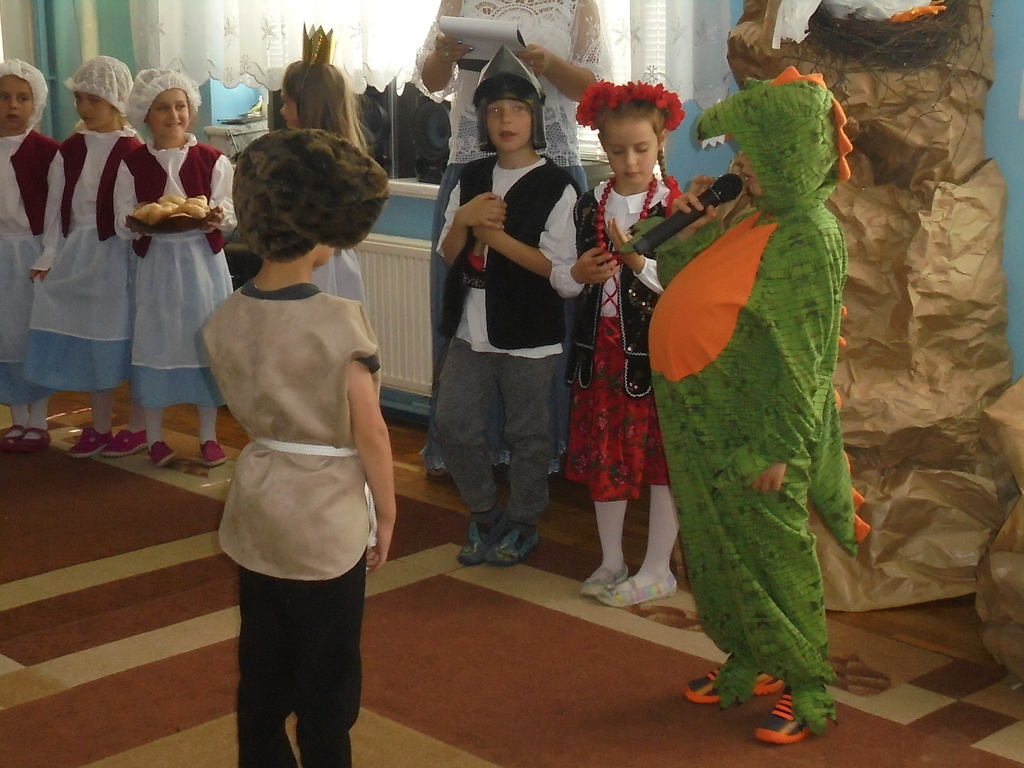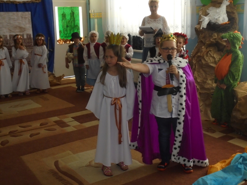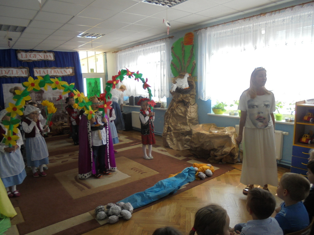 Zebrane dzieci, ich opiekunów oraz zaproszonych gości: Dyrektora Wydziału Edukacji UM Mariana Pokładeckiego, Kierownika Biblioteki Publicznej Urszulę Piątyszek, Prezesa Klubu Nauczycieli Polskich i Polonijnych Małgorzatę Tomczak, Radnego Rady Miasta Gniezna Ryszarda Karmolińskiego, emerytowaną dyrektor Przedszkola nr 6 Leokadię Mikułę powitała dyrektor Przedszkola nr 6 Mariola Ilnicka i zaprosiła do obejrzenia oraz wysłuchania inscenizacji „Dawno, dawno temu…” w wykonaniu dzieci z oddziału III „Bławatki” pod kierunkiem nauczycielki Barbary Pisarek. Starannie dobrana dekoracja, stroje i rekwizyty aktorów sprawiły, że widzowie z przedstawienia mogli dowiedzieć się wielu ciekawych rzeczy o korzeniach i historii naszego państwa. Następnie dzieci uczestniczące w konkursie przeszły „w plener” do sztalug i po wysłuchaniu krótkiego komentarza plastyczki Basi Pisarek przystąpiły do pracy. Powstały piękne, ekspresyjne obrazy opowiadające o dawnych czasach.