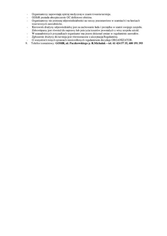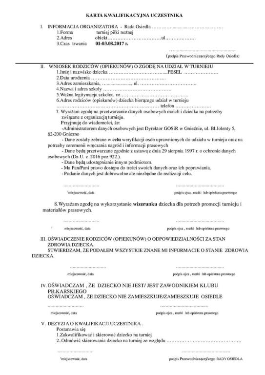 Zgłoszenia drużyn należy dokonać na dołączonym formularzu w terminie do 25.07.2017 roku (7 dni przed imprezą) od 8.00 do 15.00 w biurze GOSiR przy ul. Jolenty 5 (tel. 61 424 86 00).