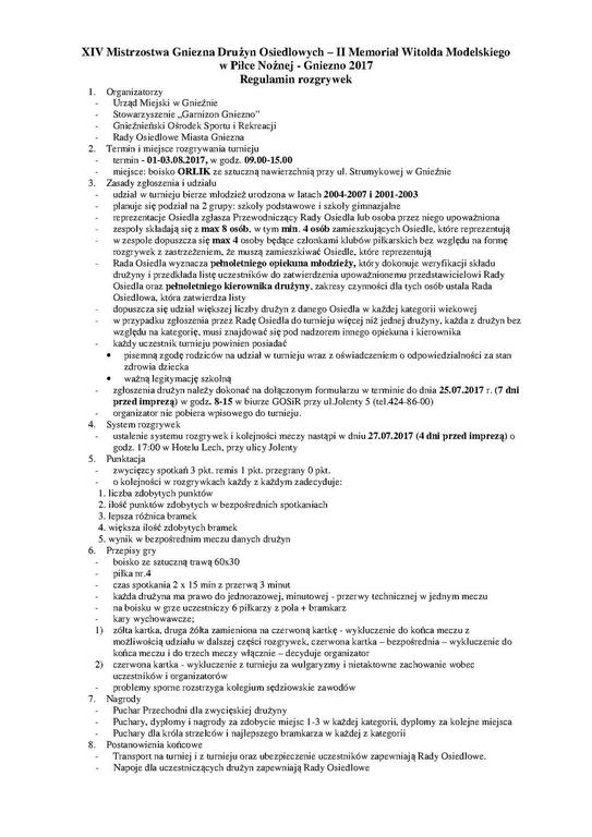 Gnieźnieński Ośrodek Sportu i Rekreacji wraz z Urzędem Miejskim w Gnieźnie, Stowarzyszeniem „Garnizon Gniezno" i Radami Osiedlowymi Miasta Gniezna zaprasza na Mistrzostwa Gniezna Drużyn Osiedlowych - II Memoriał Witolda Modelskiego w Piłce Nożnej Gniezno 2017.