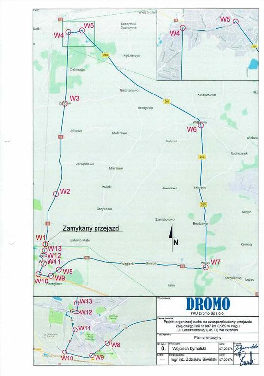 Referat Dróg Gminnych informuje, że zgodnie z otrzymanym do zaopiniowania Projektem stałej organizacji ruchu planowana jest realizacja zadania pn. „Przebudowa przejazdu kolejowego na linii kolejowej nr 807 km. 0,969 w ciągu ul. Gnieźnieńskiej (DK 15) we Wrześni”. W związku z przebudową przejazdu, konieczne jest całkowite zamknięcie drogi krajowej nr 15 w rejonie ww. przejazdu. Projekt organizacji ruchu zakłada prowadzenie objazdu drogą krajową nr 15, ul. Wolności w Gnieźnie, drogą wojewódzką nr 260 oraz drogą krajową nr 92. Przewidywany termin wprowadzenia tymczasowej organizacji ruchu to 4 sierpnia 2017 r. Czas trwania tymczasowej organizacji ruchu ok. 6 dni.