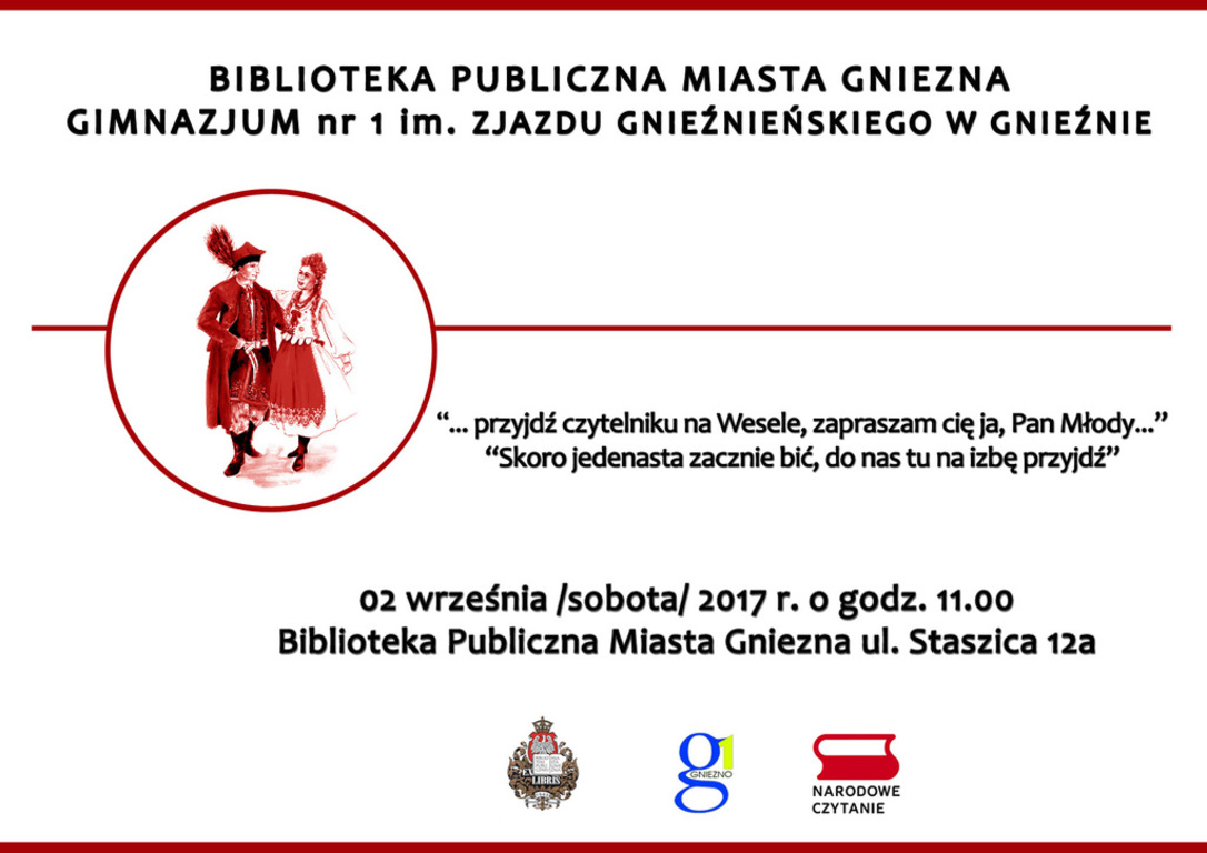 Biblioteka Publiczna Miasta Gniezna i Gimnazjum nr 1 im. Zjazdu Gnieźnieńskiego zapraszają na niezwykłe spotkanie z bohaterami dramatu „Wesele” Stanisława Wyspiańskiego podczas „Narodowego Czytania”. Utwór ten to swoisty „portret własny" Polaków przełomu XIX i XX w.