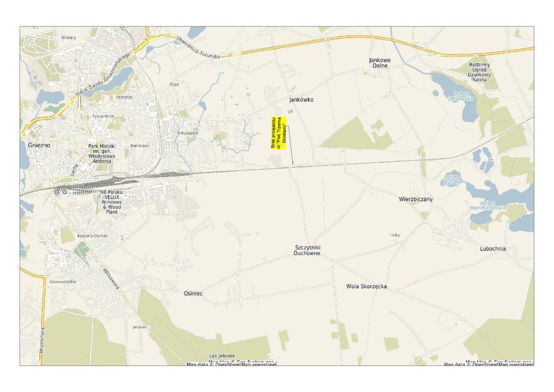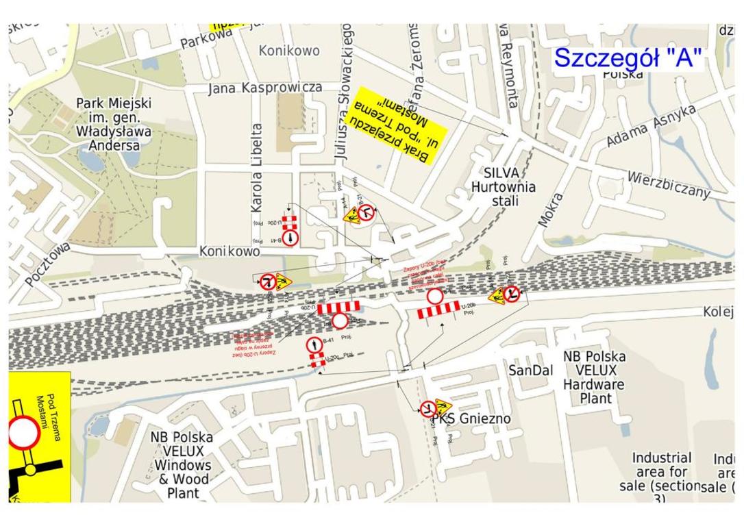 Między 21 a 31 sierpnia 2017 roku nastąpi całkowite zamknięcie dla ruchu samochodowego, pieszego i rowerowego ulicy Pod Trzema Mostami w Gnieźnie. W powyższym terminie prowadzone będą prace rozbiórkowe dwóch nieczynnych wiaduktów kolejowych nad ul. Pod Trzema Mostami. Na tablicach znajdujących się na skrzyżowaniu ul. Witkowskiej i ul. Słonecznej wskazane zostanie schematycznie miejsce zamknięcia drogi. Prócz tego, na ulicach dolotowych ustawione zostaną tablice „Brak przejazdu ulicą Pod Trzema Mostami". Szczegóły oznakowania podane są w załącznikach graficznych.