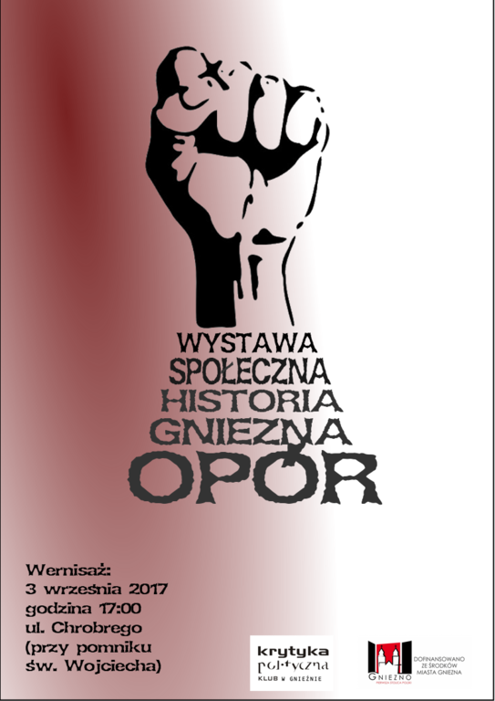 Koniec wakacji to dobra pora żeby rozpocząć sezon wystawowy. Po cyklu związanym z architekturą Klub Krytyki Politycznej w Gnieźnie pragnie zaprosić na historię gnieźnieńskich protestów. Wystawa „Społeczna historia Gniezna - Opór" zapoczątkuje nowy cykl, w którym zostanie pokazana cywilna historia miasta. Wernisaż odbędzie się 3 września 2017, o godzinie 17:00 na placu przy pomniku św. Wojciecha ul. Chrobrego.