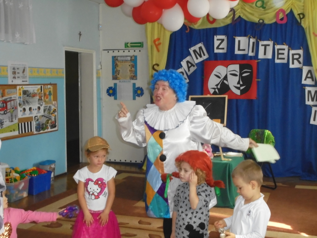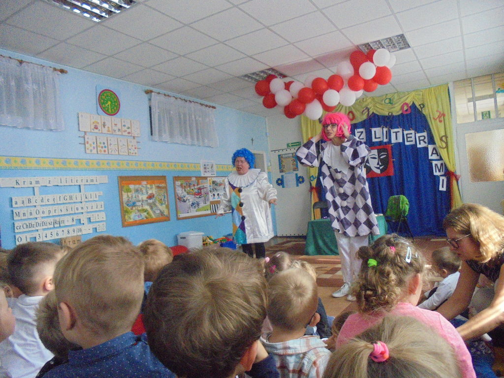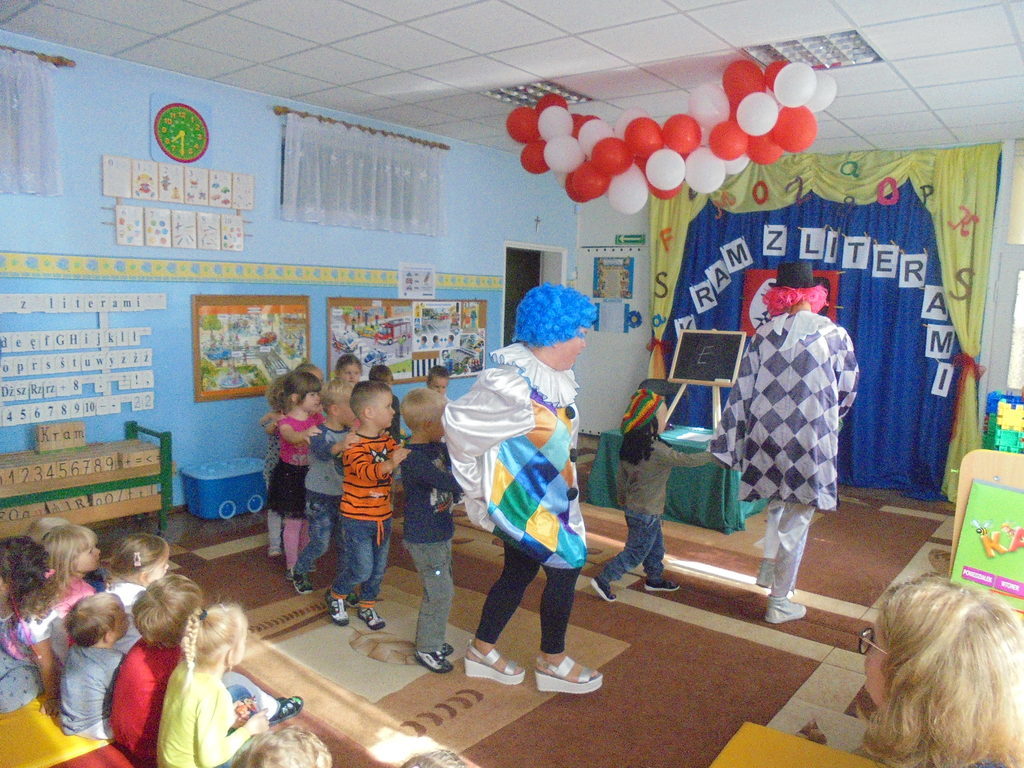 18 września 2017 roku wszystkie przedszkolaki obejrzały, a także aktywnie uczestniczyły w przedstawieniu „Kram z literami”. Spektakl oparty na wierszach Wandy Chotomskiej w dowcipny i żartobliwy sposób przedstawiał po kolei, „na wesoło” wszystkie litery alfabetu nadając każdej z nich indywidualny charakter. Profesjonalna gra aktorska, zmieniające się rekwizyty oraz włączanie dzieci do współtworzenia przedstawienia sprawiło, że przedszkolaki z zaciekawieniem i niepostrzeżenie chłonęły wiedzę o polskim języku. Interesujące zabawy i ćwiczenia logopedyczne oraz oprawa muzyczna uatrakcyjniły imprezę i sprawiły, że nauka stała się wesołą i łatwą zabawą przynosząc radość dzieciom. Spektakl zorganizowany został w ramach kampanii społecznej Cała Polska czyta dzieciom.