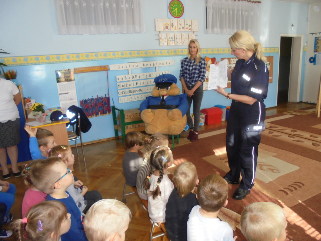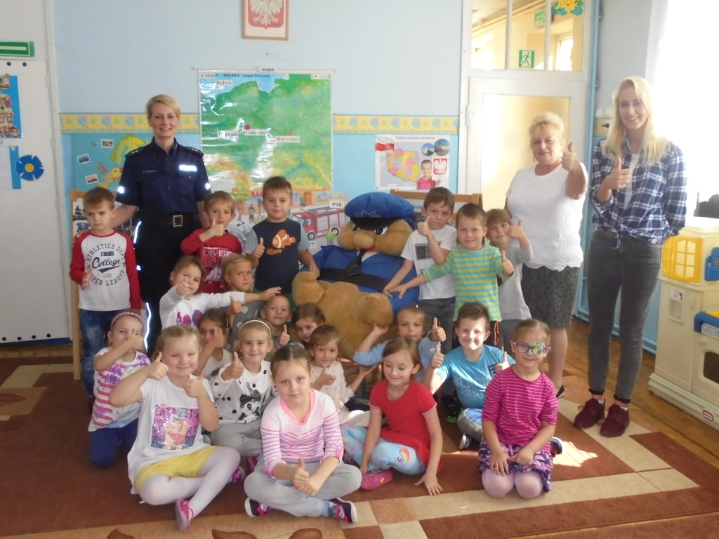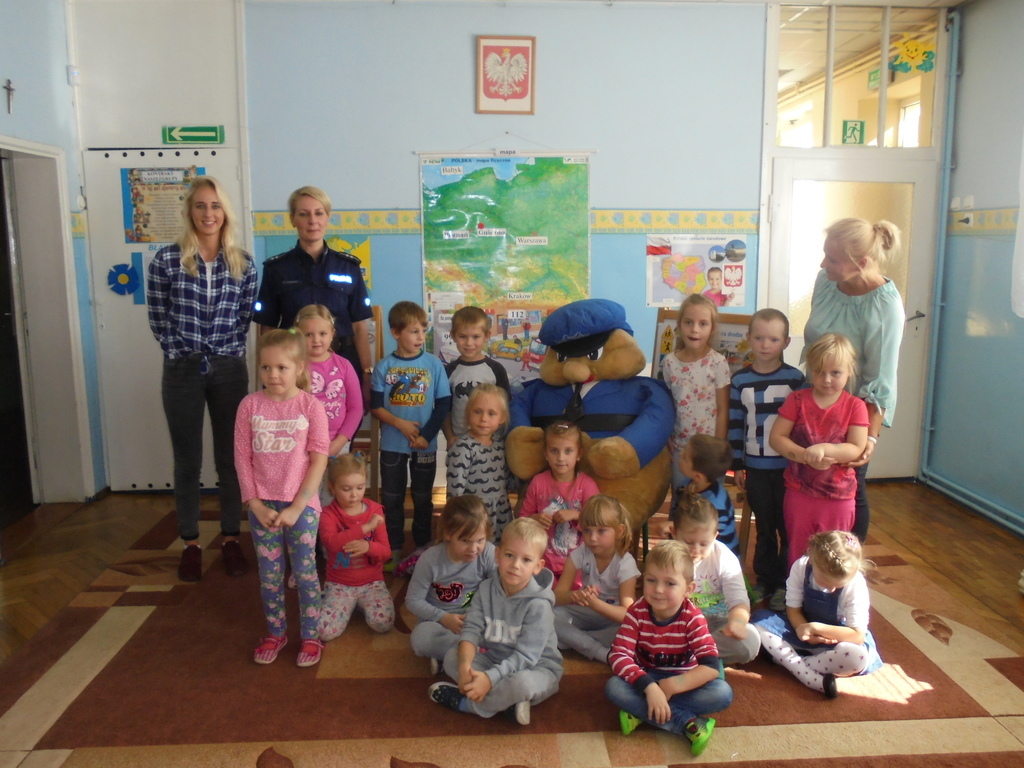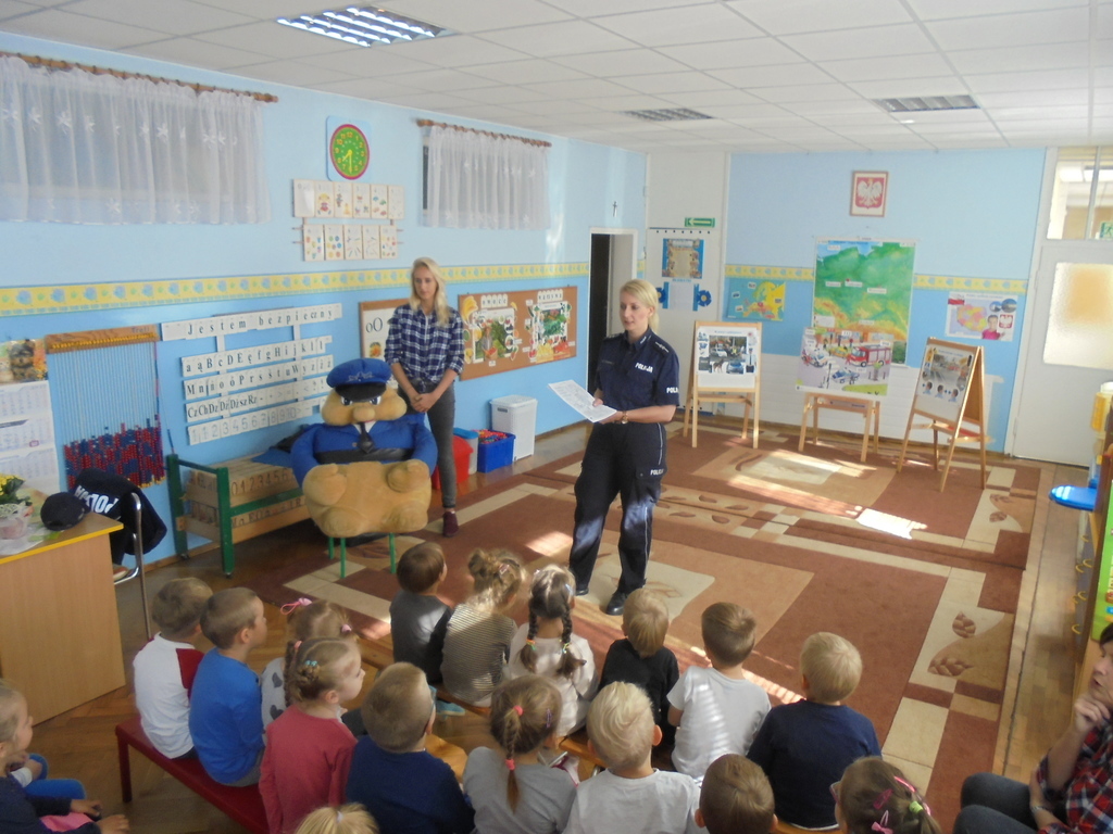 Finalnym punktem realizacji wrześniowych zadań o bezpieczeństwie była wizyta w przedszkolu przedstawicielki Gnieźnieńskiej Policji – mł. asp. Agnieszki Franckiewicz w towarzystwie asystentki i uwielbianego przez dzieci sierżanta Pyrka. Wizyta miała miejsce 29 września 2017 roku, w godzinach dopołudniowych w sali „Bławatki”, a zorganizowana została przez nauczycielkę G. Karwasińską.