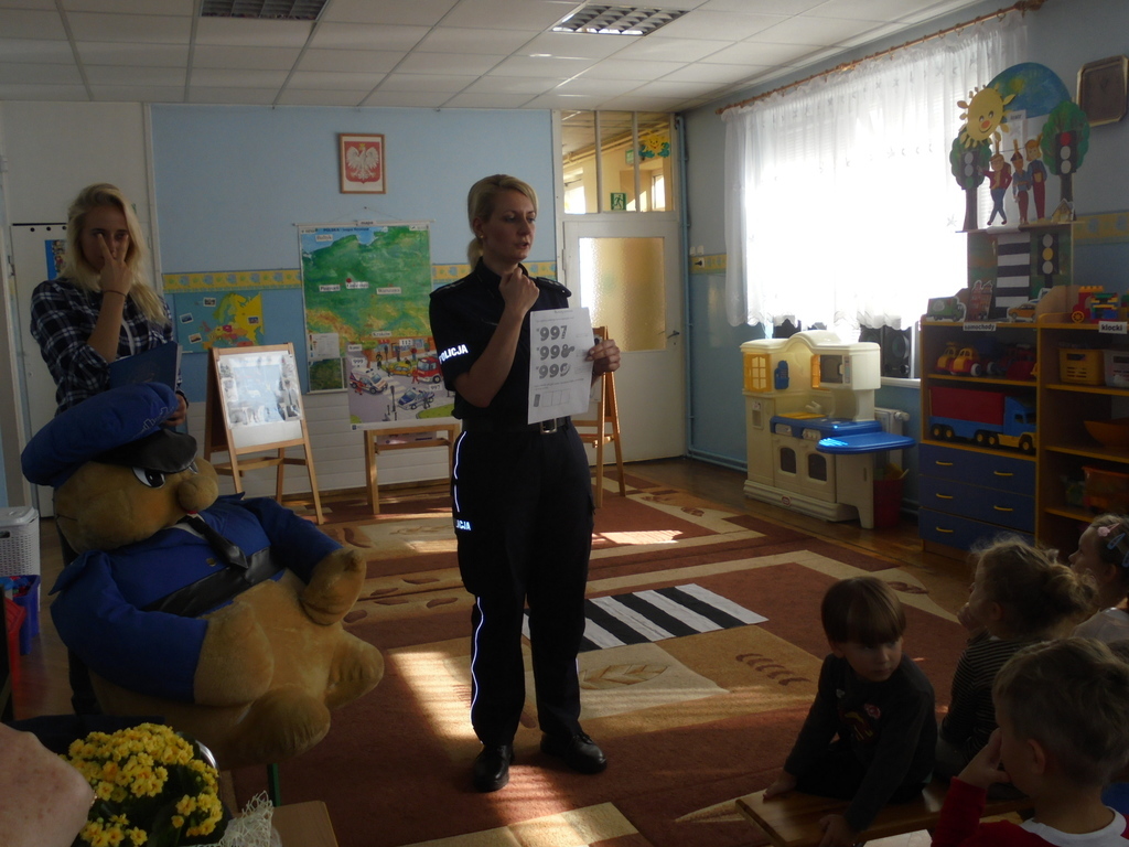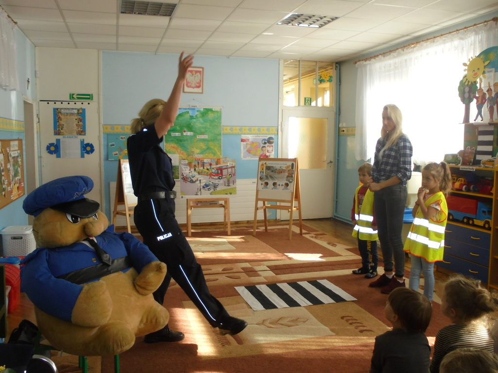 W obecności policjantki przedszkolacy utrwalili sobie zasady prawidłowego przechodzenia przez ulicę z sygnalizacją świetlną i bez niej, znaczenie posiadania odblasków w ruchu ulicznym, potrzebę zapinania pasów w samochodzie oraz zaznajomili się z zasadami zachowania się w obecności nieznajomego czy podczas zgubienia się w dużym sklepie. Podczas spotkania dzieci spontanicznie dzieliły się swoją wiedzą z zakresu ruchu drogowego, doświadczeniami wynikającymi z podróżowania samochodem z rodzicami czy znajomością numerów alarmowych. Chcąc zapamiętać szczególnie nr alarmowy 112 – pani Agnieszka podpowiedziała dzieciom niecodzienny sposób: mamy 1 usta, 1 nos, 2 oczu.