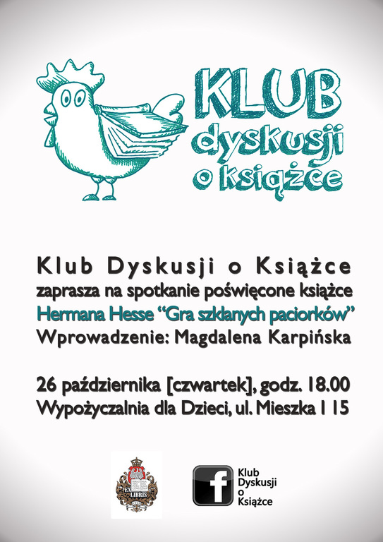 "Gra szklanych paciorków" to po prostu niezwykłe doświadczanie literatury. Na zasadzie "książkowego eksperymentu" warto sprawdzić, jakie odczucia wzbudzi ta lektura u pozostałych członków Klubu. Jak Państwo odczytają życie Józefa Knehta? Czy zostaną Państwo zauroczeni światem prezentowanym przez Hessego? Rozmowa na temat książki 26 października (w czwartek) o 18.00 w Wypożyczalni dla Dzieci, przy ul. Mieszka I 15. Serdecznie zapraszamy w imieniu Klubu Dyskusji o Książce.