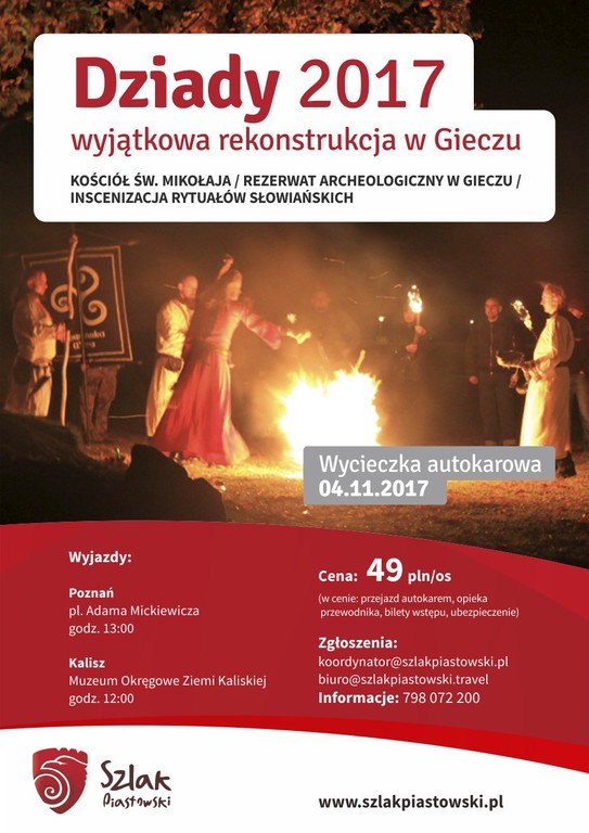 Klaster Turystyczny „Szlak Piastowski w Wielkopolsce” od niedawna pełni również rolę biura podróży, organizującego turystykę przyjazdową na szlak. Pierwsza wycieczka autokarowa została zaplanowana już 4 listopada. Celem podróży będzie Giecz, a konkretnie zwiedzanie kościoła św. Mikołaja, rezerwatu archeologicznego oraz – co najważniejsze – udział w inscenizacji rytuałów słowiańskich związanych ze świętem zmarłych – Dziady 2017.