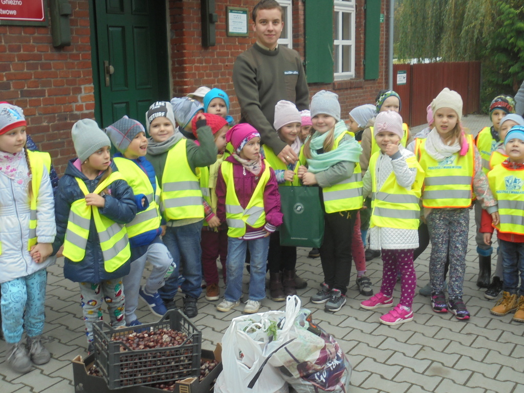 Jak co roku Przedszkole nr 6 „Polne Kwiaty” w Gnieźnie bierze udział w akcji „Pomagamy zwierzętom leśnym przetrwać zimę”. Dzieci ze wszystkich oddziałów przynosiły do przedszkola żołędzie, kasztany, suchy chleb, warzywa, a najstarsze „Bławatki” i „Bratki”, 23 października 2017 roku wybrały się do Lasu Miejskiego, by w imieniu wszystkich przekazać zebraną karmę leśnikom.