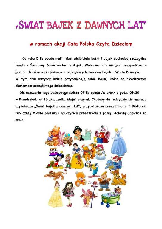 Dla uczczenia tego baśniowego święta 7 listopada 20147 o 9.30 w Przedszkolu nr 15 „Pszczółka Maja” przy ul. Chudoby 4a odbędzie się impreza czytelnicza „Świat bajek z dawnych lat”, przygotowana przez Filię nr 2 Biblioteki Publicznej Miasta Gniezna i nauczycieli przedszkola z Jolantą Jagielicz na czele.