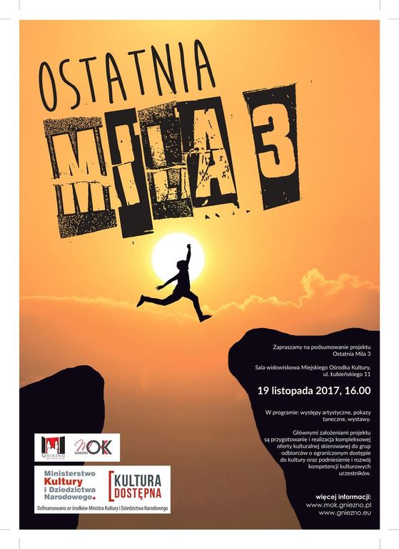 Niepełnosprawność, status społeczny czy wiek często utrudniają korzystanie z owoców kultury. Aby przeciwdziałać takiemu wykluczeniu, Miejski Ośrodek Kultury już po raz trzeci realizował przez kilka ostatnich miesięcy specjalny projekt dofinansowany ze środków zewnętrznych: „Ostatnia mila 3”. 19 listopada 2017 roku o 16.00 właśnie w MOK odbędą się specjalne pokazy podsumowujące wszystkie zajęcia w ramach projektu. Zobaczyć będzie można efekty warsztatów tanecznych, muzycznych, teatralnych czy fotograficznych. Wstęp na całe wydarzenie jest wolny.