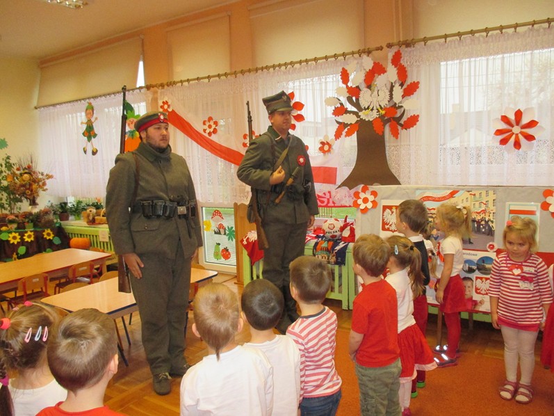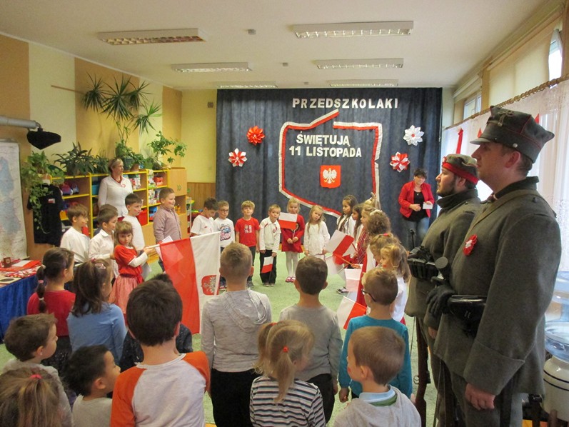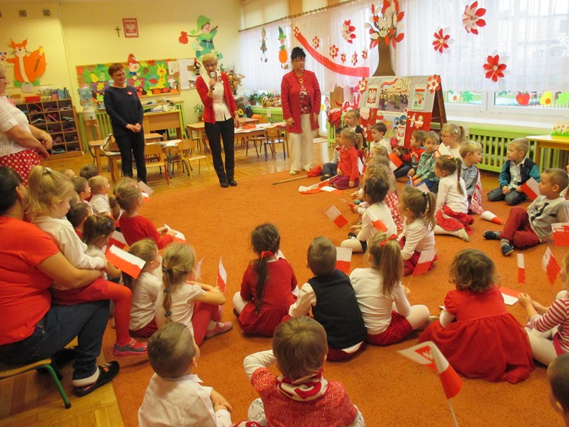 Tego dnia w grupach Sarenki, Misie i Wiewiórki, Pani Miecia i Krysia z Uniwersytetu Trzeciego Wieku wykonywały wspólnie z dziećmi kotyliony. Szacunek i miłość do Ojczyzny przedszkolacy wyrazili poprzez odśpiewanie Mazurka Dąbrowskiego, recytację wiersza i śpiewanie piosenek o charakterze patriotycznym. Odświętne stroje dzieci, chorągiewki biało – czerwone, kotyliony oraz wystrój przedszkola stanowiły dopełnienie atmosfery panującej tego dnia.