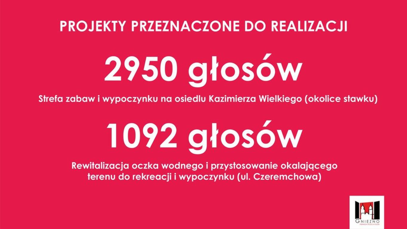Zdecydowanym zwycięzcą okazał się projekt „Strefa zabaw i wypoczynku na os. Kazimierza Wielkiego (teren wokół stawku)”, zdobywając 2950 głosów (31,9%). W ramach zadania wykonane mają zostać ścieżki asfaltowe z namalowanymi grami podwórkowymi, urządzenia edukacyjne, (gra kółko i krzyżyk, liczydło, krążki, cymbałki, dzwonki, bębny itp.) oraz ławki, stojaki na rowery i kosze na śmieci i psie odchody. Projekt wyceniono na 330 000 złotych.