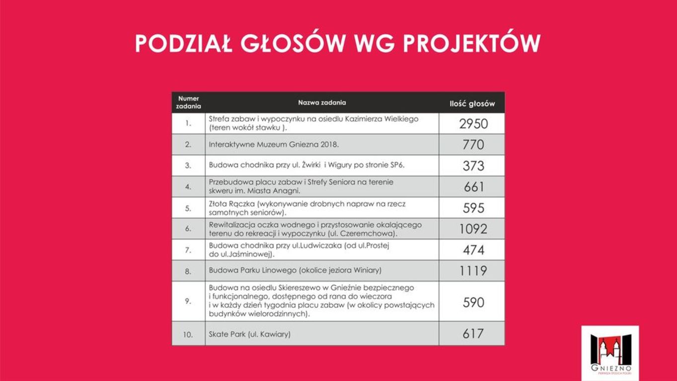 Tegoroczne głosowanie na Budżet Obywatelski Miasta Gniezna odbyło się pomiędzy 6 a 17 listopada. Poparcie dla wybranych przez siebie projektów mieszkańcy mogli zgłaszać zarówno za pośrednictwem stacjonarnych punktów do głosowania (5 lokalizacji), jak również przez internet. Łącznie do urn i w formie elektronicznej wpłynęły 6303 wypełnione karty. Równe 300 z nich było nieważnych. Każdy mieszkaniec mógł głosować maksymalnie na 3 projekty, a łączna liczba głosów oddanych na poszczególne propozycje wyniosła 9241.