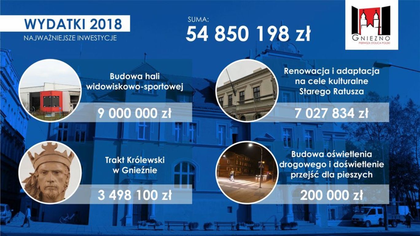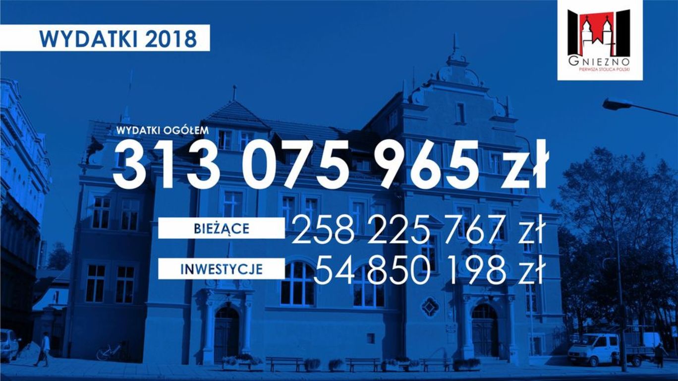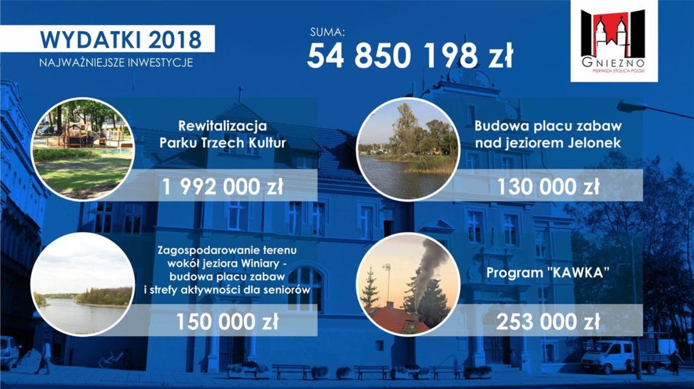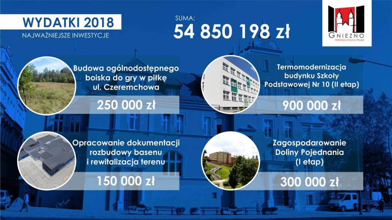 Ogółem miejskie wydatki w przyszłym roku wyniosą 313 mln zł, z czego bieżące to 258 mln zł, a inwestycyjne aż 54 mln 850 zł. Na wiele inwestycji Miasto Gniezno pozyskało środki zewnętrzne. w 2018 roku będzie to w sumie aż 17 721 526 zł. Pieniądze będą spożytkowane na realizację następujących inwestycji: