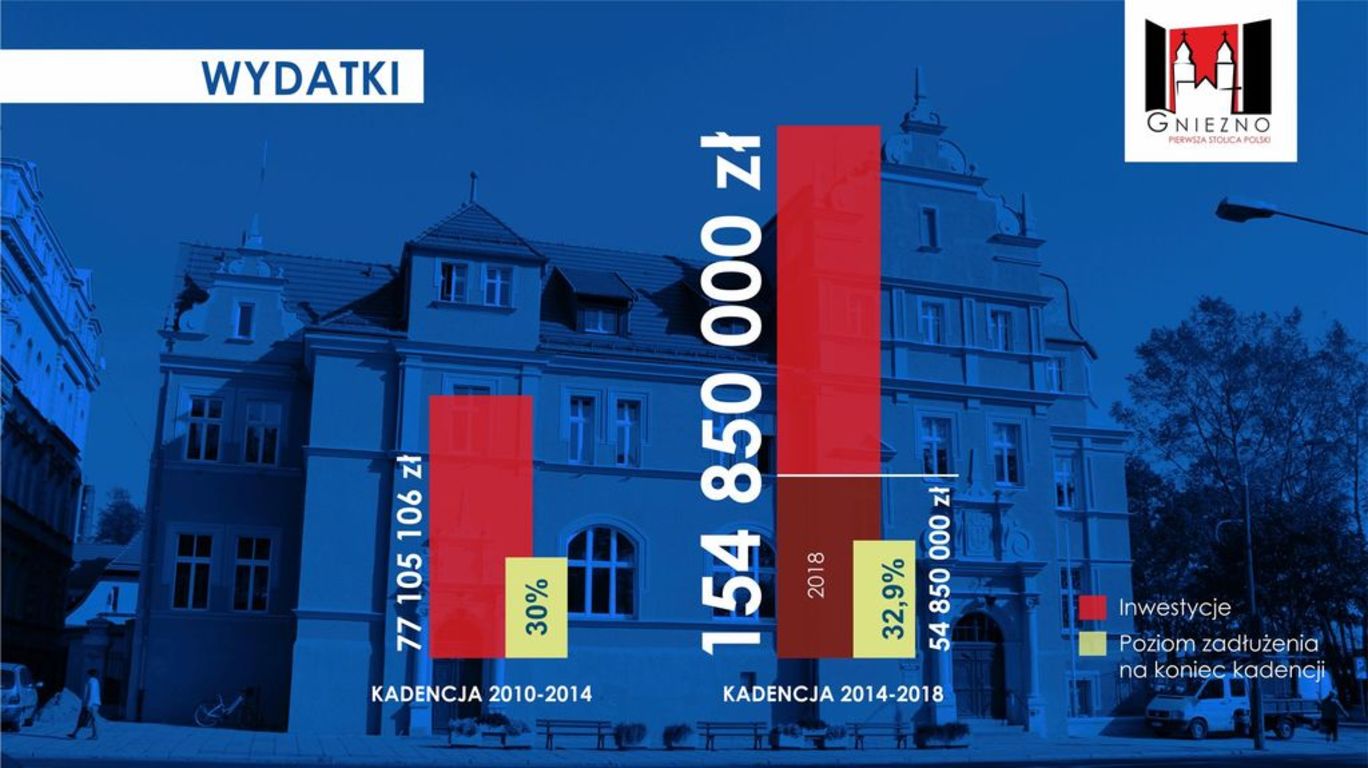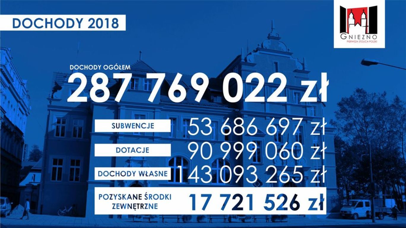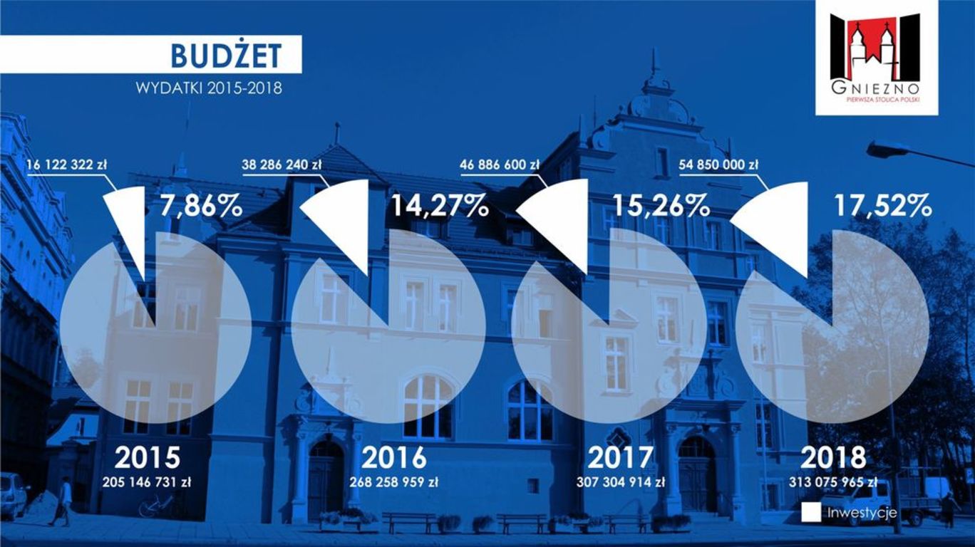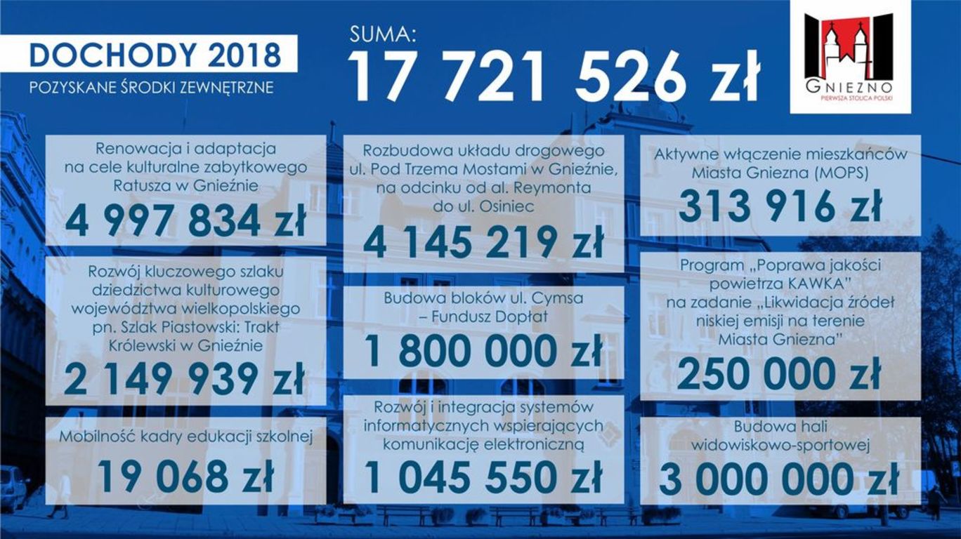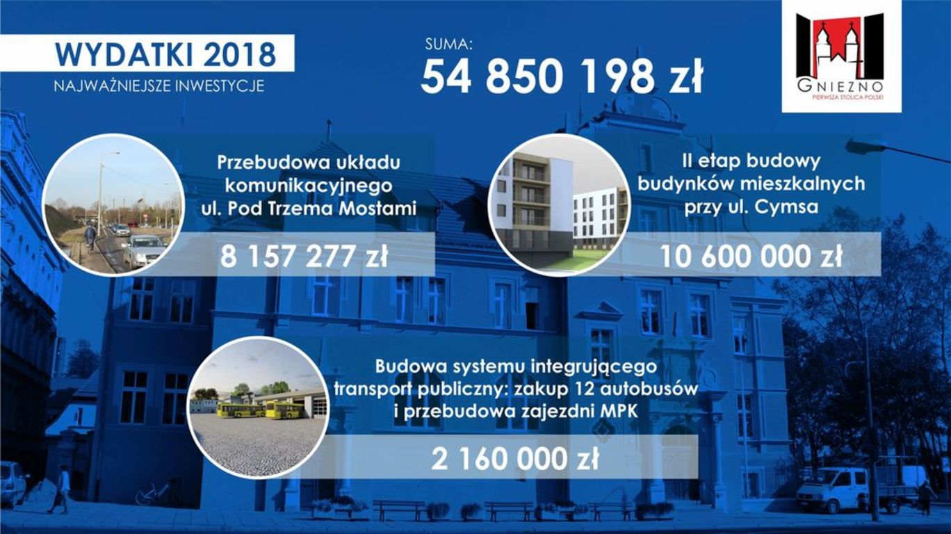 Ogółem miejskie wydatki w przyszłym roku wyniosą 313 mln zł, z czego bieżące to 258 mln zł, a inwestycyjne aż 54 mln 850 zł. Na wiele inwestycji Miasto Gniezno pozyskało środki zewnętrzne. w 2018 roku będzie to w sumie aż 17 721 526 zł. Pieniądze będą spożytkowane na realizację następujących inwestycji:
