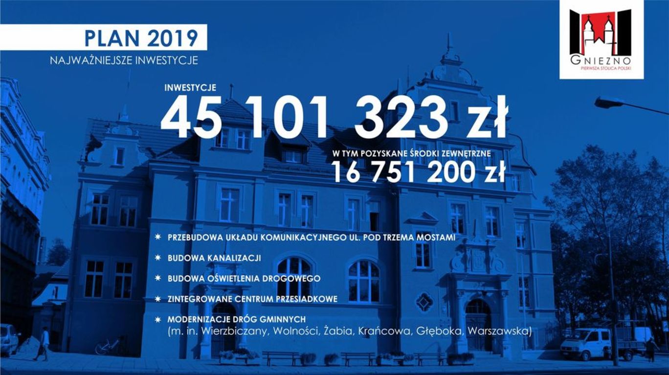 Poziom zadłużenia Miasta Gniezna od lat wynosi około 30 % (przepisy prawa dopuszczają zadłużenie w wysokości do 60 %). Przy inwestycjach na poziomie 55 mln zł w 2018 r. wyniesie dokładnie 32,9 %. Plany inwestycyjne na 2019 roku. Już dziś wiadomo, że Miasto Gniezno w 2019 roku pozyska aż 16 mln 751 tys. środków zewnętrznych z Unii Europejskiej, na realizację rozbudowy układu drogowego ul. Pod Trzema Mostami. W sumie w 2019 roku na inwestycje zostanie przeznaczonych 45 mln zł, z czego na przebudowy dróg trafi prawie 13 mln zł, wyremontowane zostaną ulice: Wierzbiczany, Wolności, Żabia, Krańcowa, Głęboka i Warszawska.