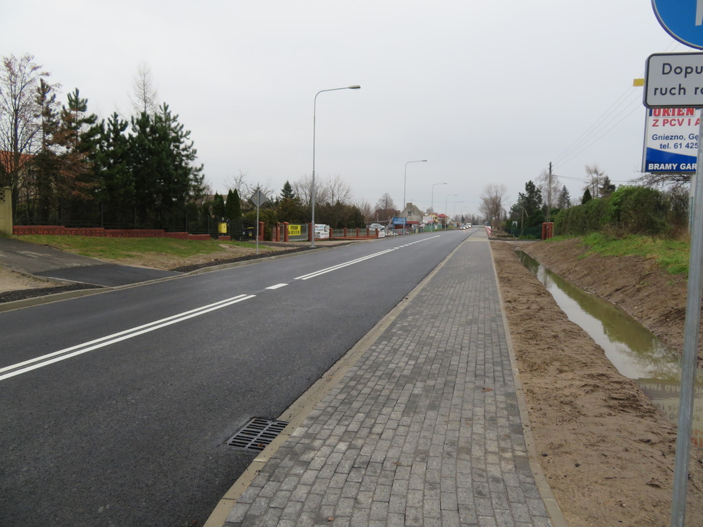 Po robotach kanalizacyjnych ułożono krawężnik drogowy i wykonano nową nawierzchnię jezdni z betonu asfaltowego o szerokości 7,0 m (dotychczasowa szerokość nawierzchni wynosiła ok. 6,3 m). Ponadto wykonano jednostronny chodnik z kostki betonowej o szerokości 2 metrów. Wymieniono przewód oświetleniowy i lampy oświetleniowe. Zamontowano również nowe oznakowanie pionowe i wykonano oznakowanie poziome. Umocniono pobocze drogi, odtworzono istniejące rowy odwadniające.
